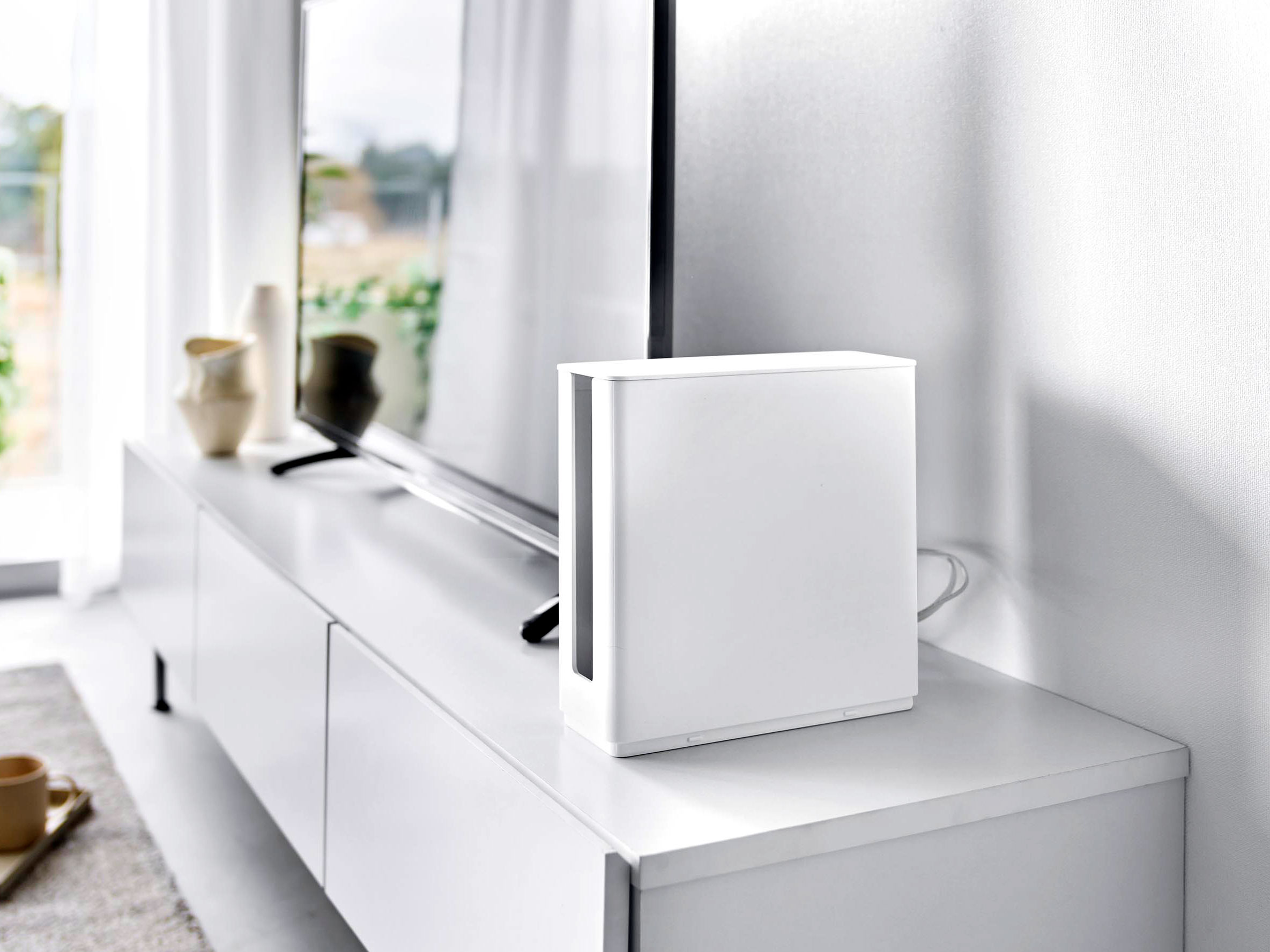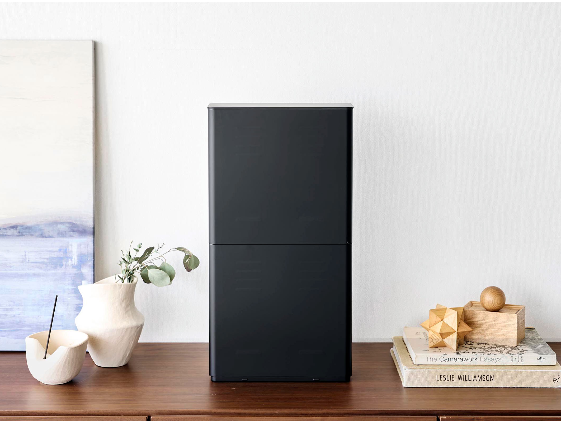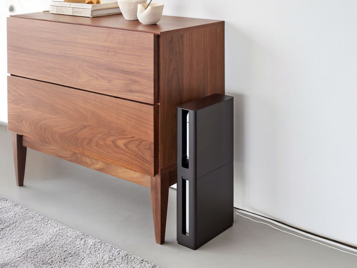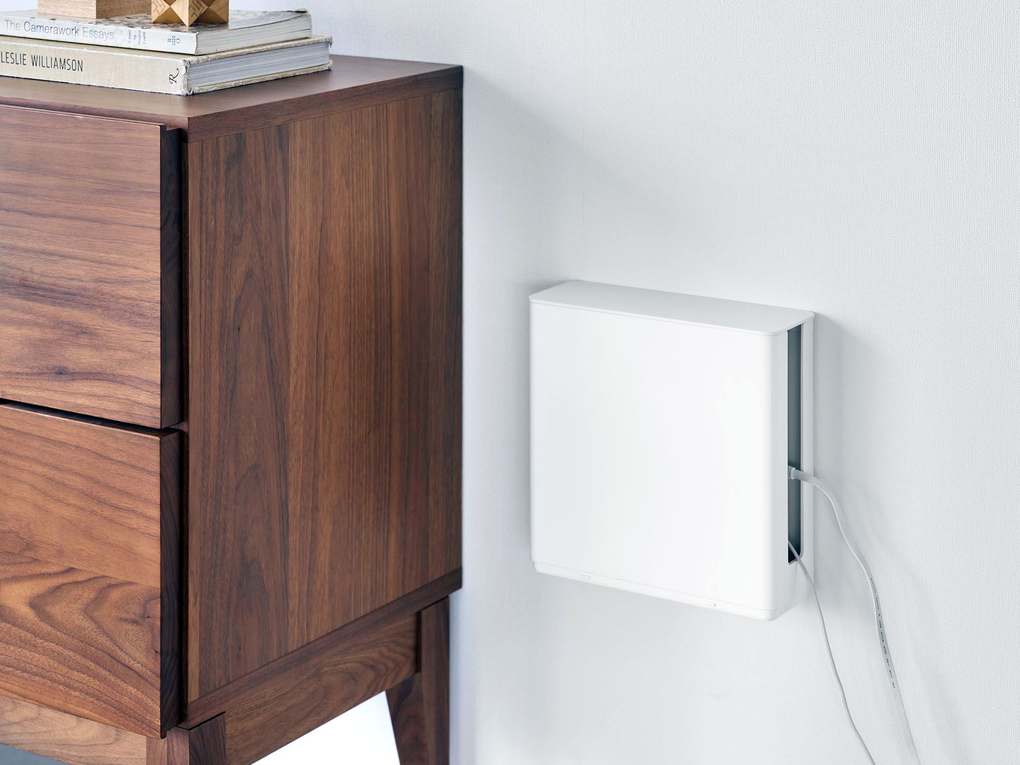 無駄を削ぎ落としたミニマルなフォルムと、マットな質感のスチールボディが特徴。リビング・書斎・寝室どこに置いても空間を引き締めてくれるデザイン性で、カラーはホワイトとブラックの2色展開。