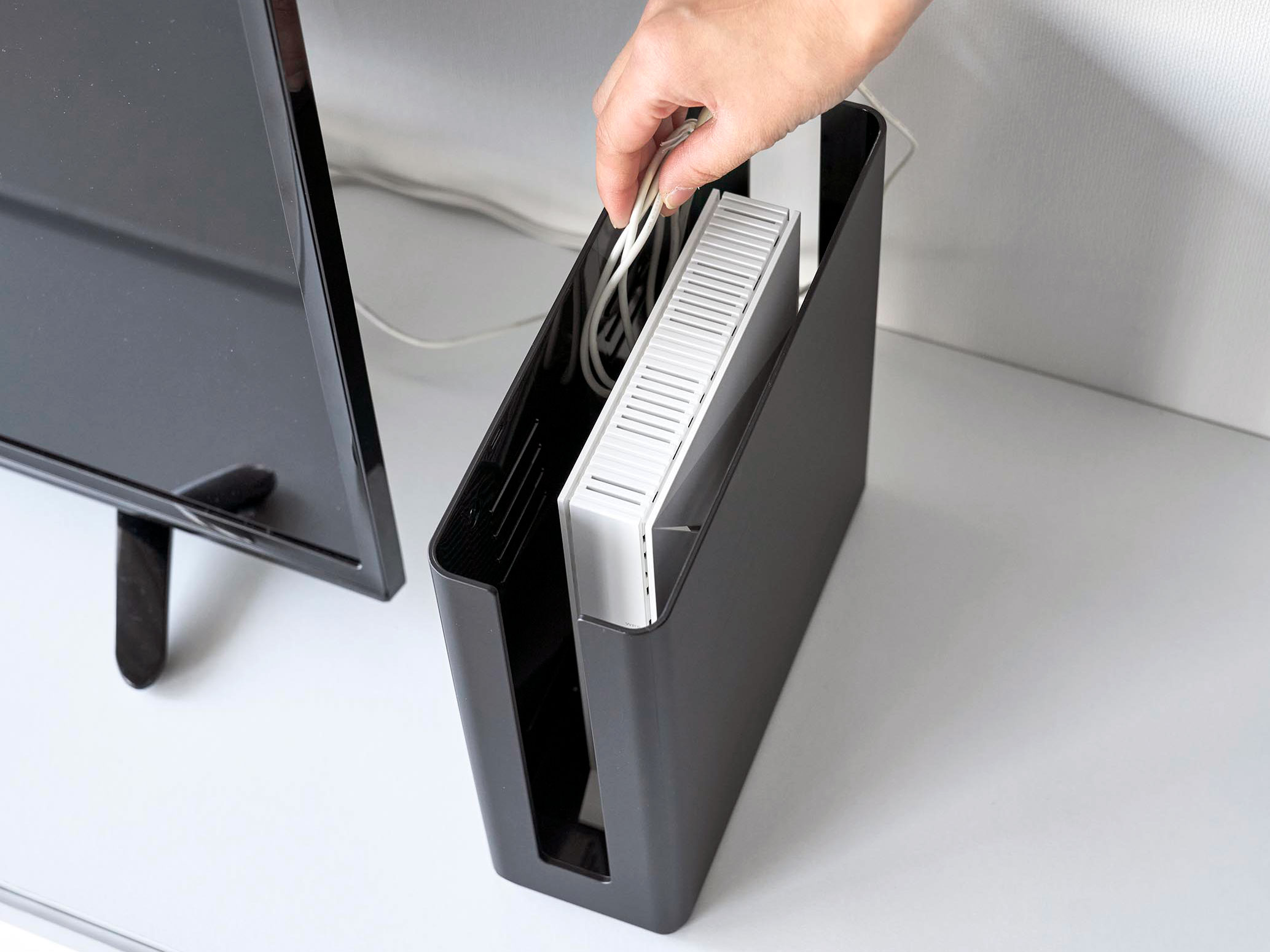 本体サイズは約24cm×奥行約9cm×高さ約24cmと、限られたスペースにも置けるスリム形状。それでいて内部は意外と広々しており、ルーターやハブ、さらには電源タップやコード類までしっかり収まります。