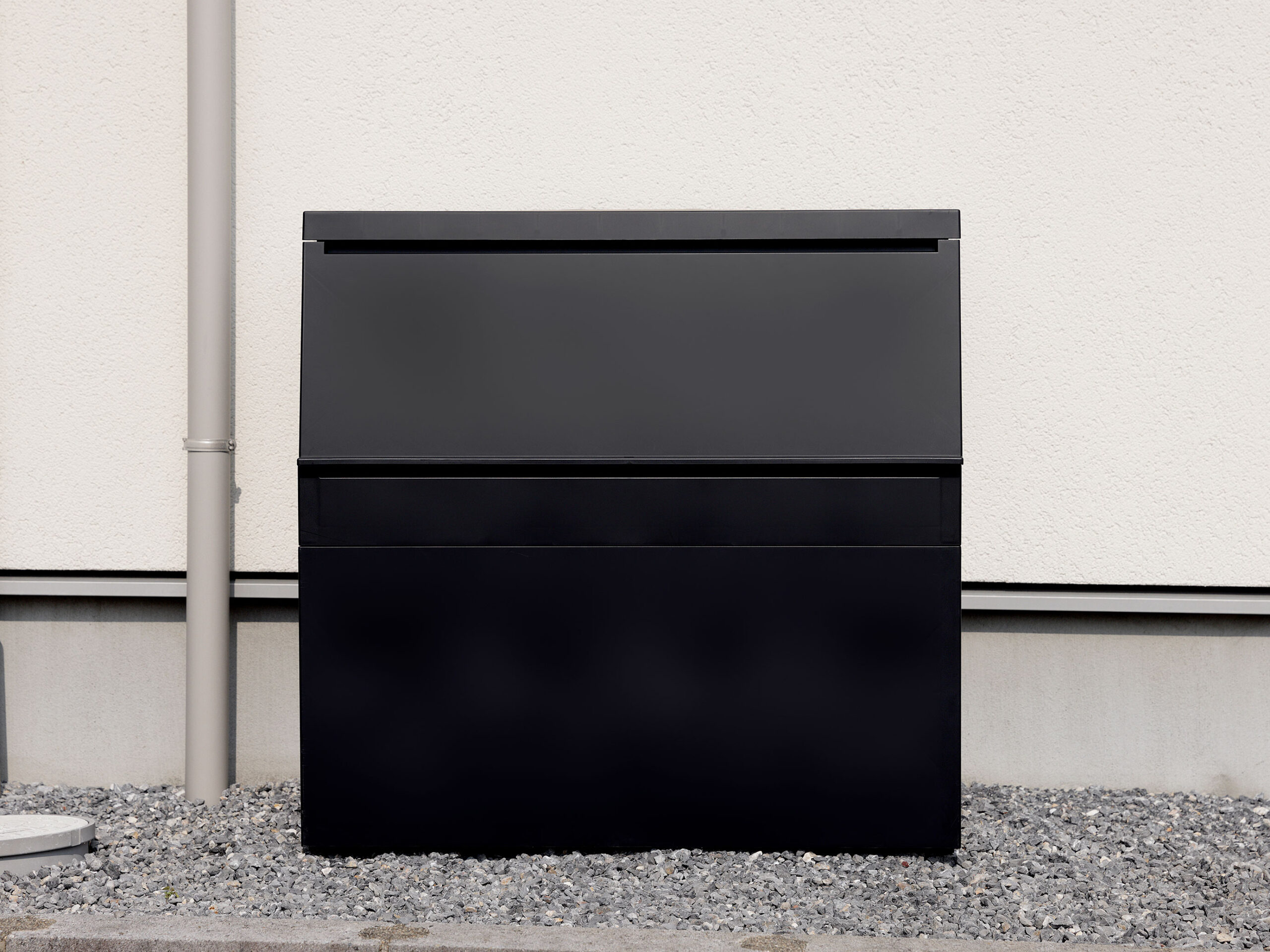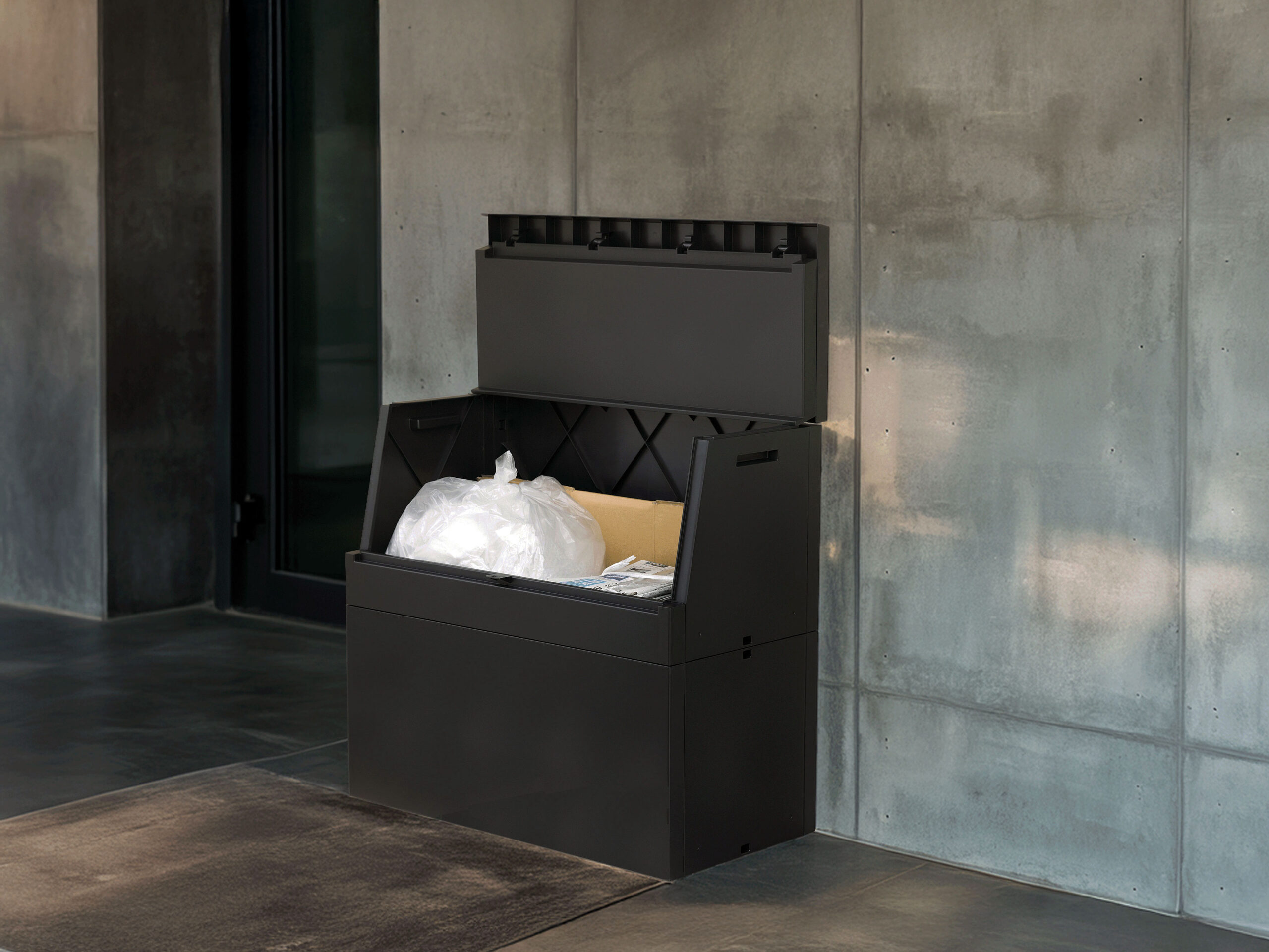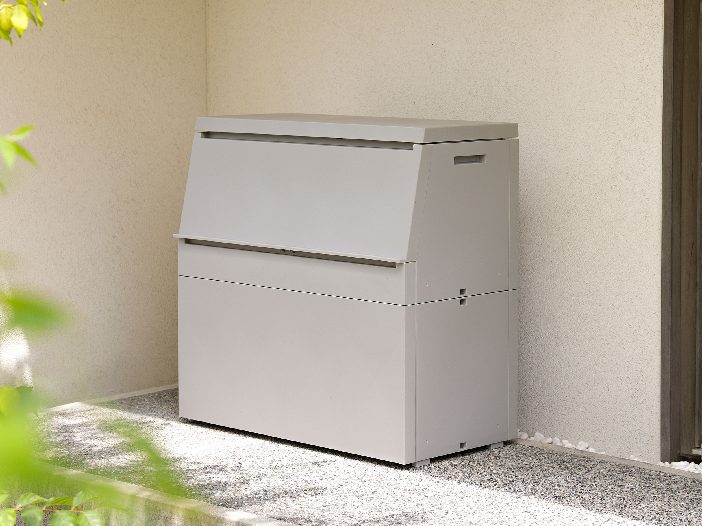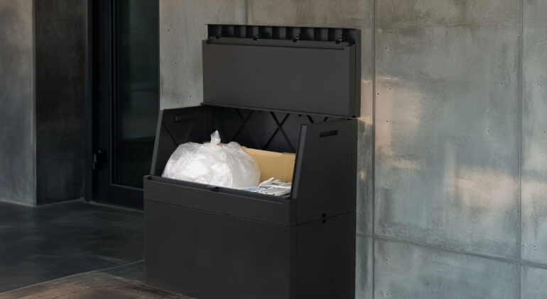 〈黒やグレーの落ち着いたカラー、装飾を抑えたミニマルなフォルム〉が、玄関・ベランダ・外壁などどんな外観にも溶け込むデザイン。ゴミ箱っぽさが目立たず、「収納家具」のような印象に仕上がります。