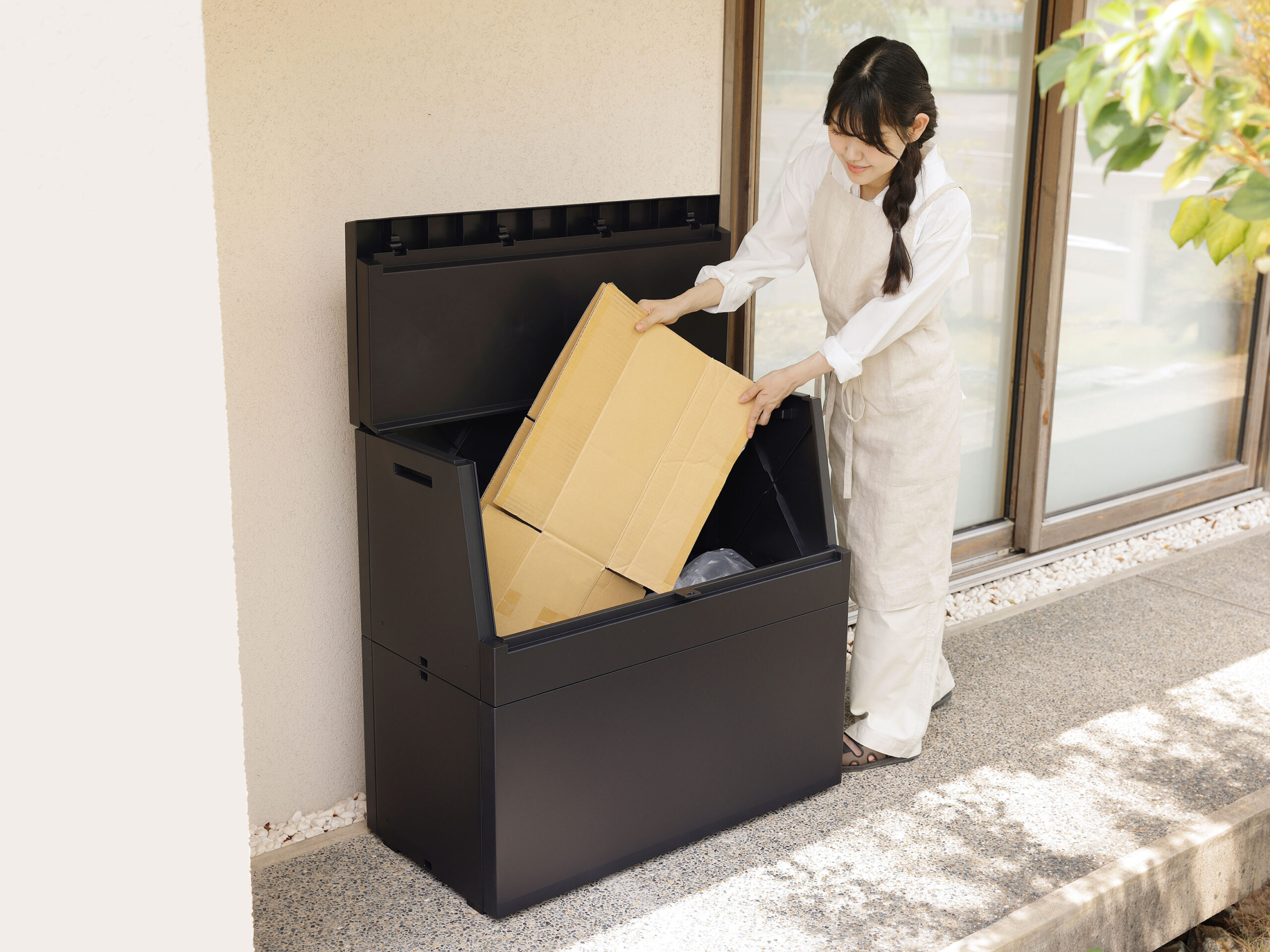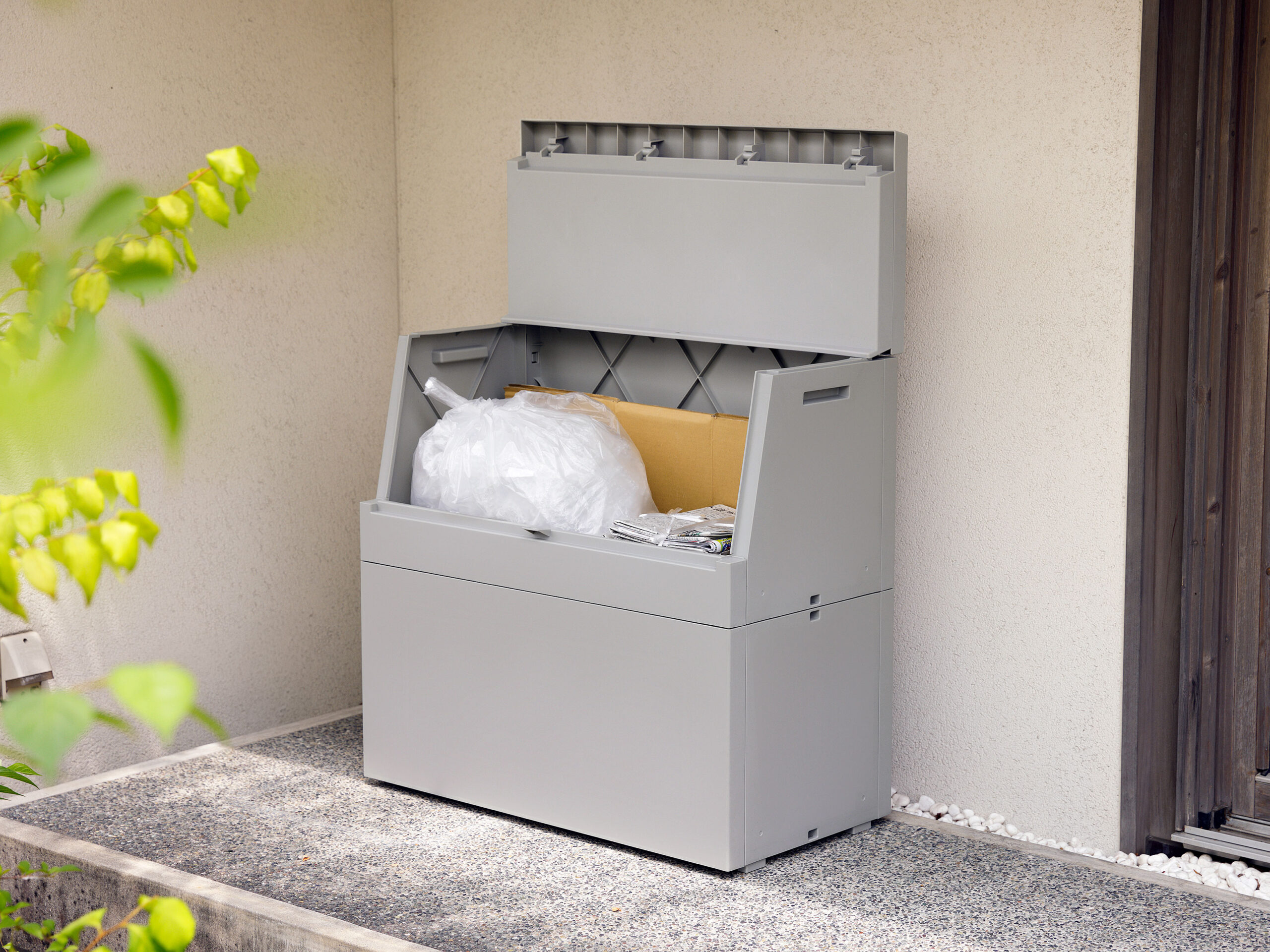 ごみ箱としてだけでなく、小さな物置、収納箱、宅配ボックス代わりなど、“屋外用マルチストッカー”として使える汎用性の高さも大きな魅力。ホース、園芸用品、掃除道具、段ボールなど、外回りの“見せたくないけど出しっぱなし”になりがちな物をまとめて収納できます。