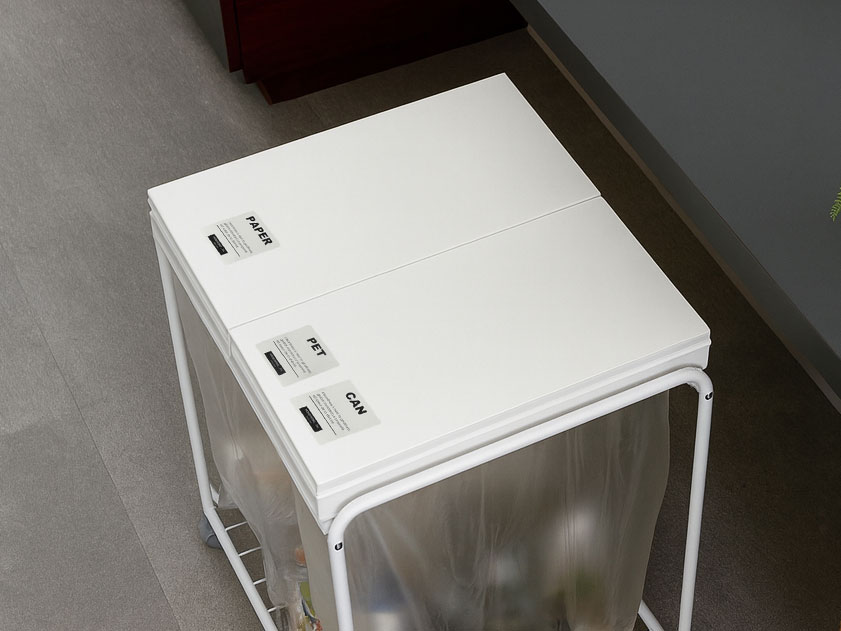 袋の取り付けは簡単な引っ掛け式で、取り出しもスムーズ。モノギャラリー限定の分別シールが付属しており、ゴミの分類もひと目で明確に。家族間での分別ルール統一にも役立ちます。