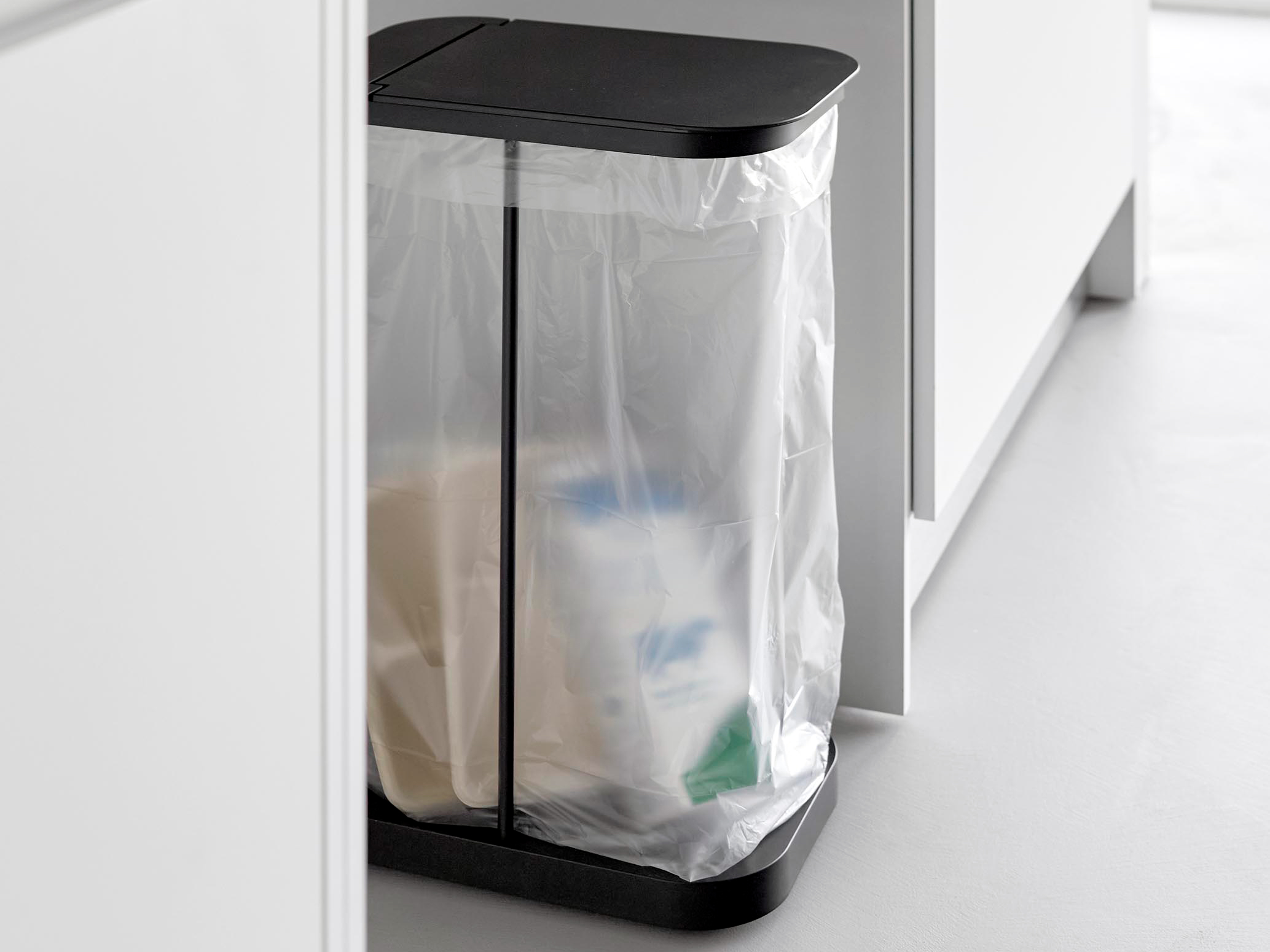 LUCE最大の特徴は、無駄を削ぎ落としたフレーム構造です。一般的なゴミ箱のような箱型ではなく、ゴミ袋をフレームに引っ掛けて使う設計。そのため、袋いっぱいまでゴミを入れることができ、デッドスペースが生まれません。上部にはカバーが付いており、袋の縁をすっきり隠してくれるため、見た目も美しく整います。生活感が出やすいゴミ袋も、カバーで覆うことで一気に洗練された印象に。キッチン空間を格上げしてくれるデザイン性が魅力です。