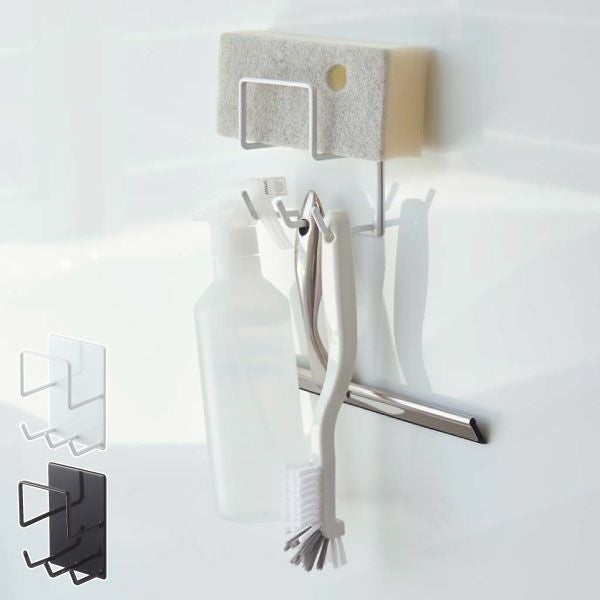 上部のホルダー部分には、約厚さ5cmまでのスポンジを収納することができます。下部の3連フック部分には、ブラシや水切りスクイージーなどを吊り下げて収納。場所を取りがちなスプレーも引っ掛けることができて便利ですね。