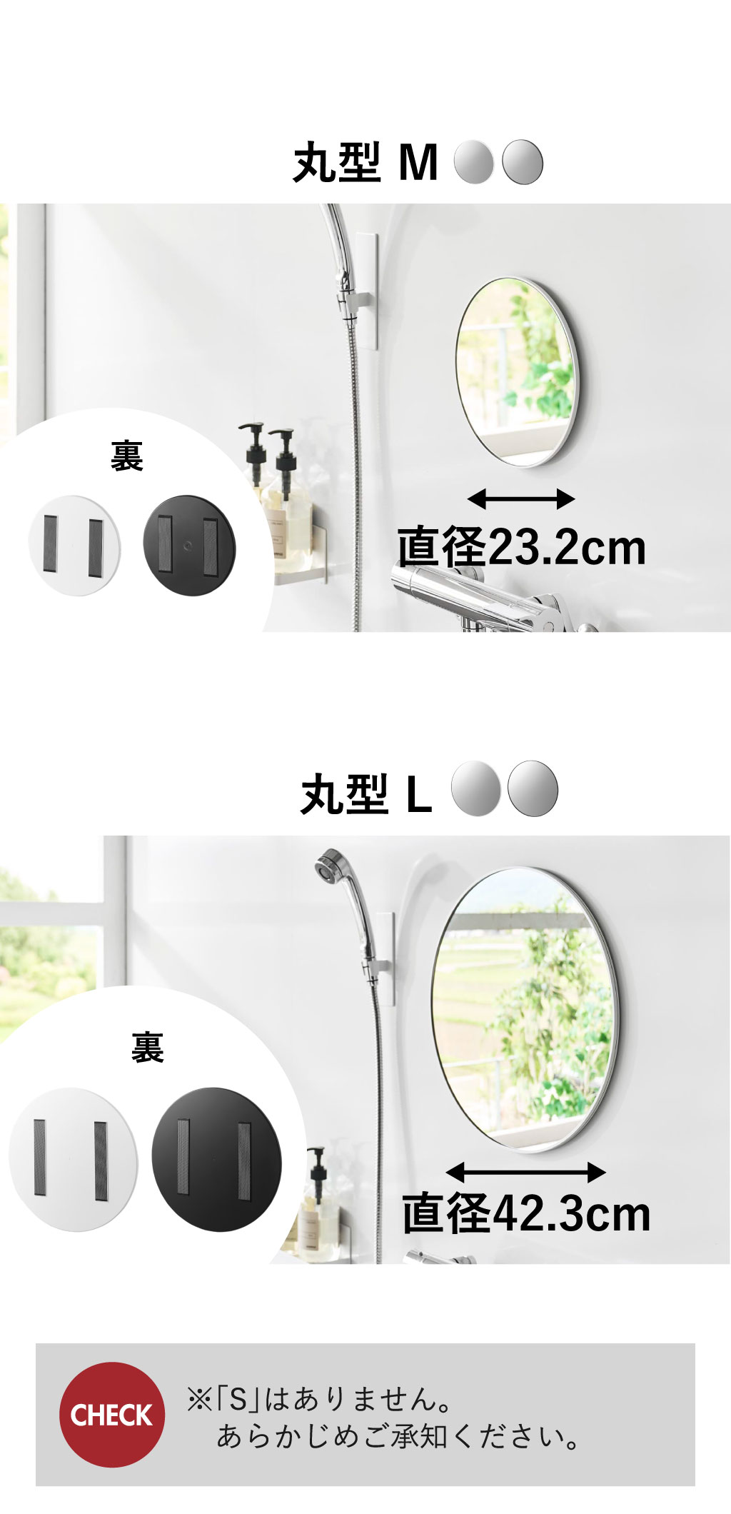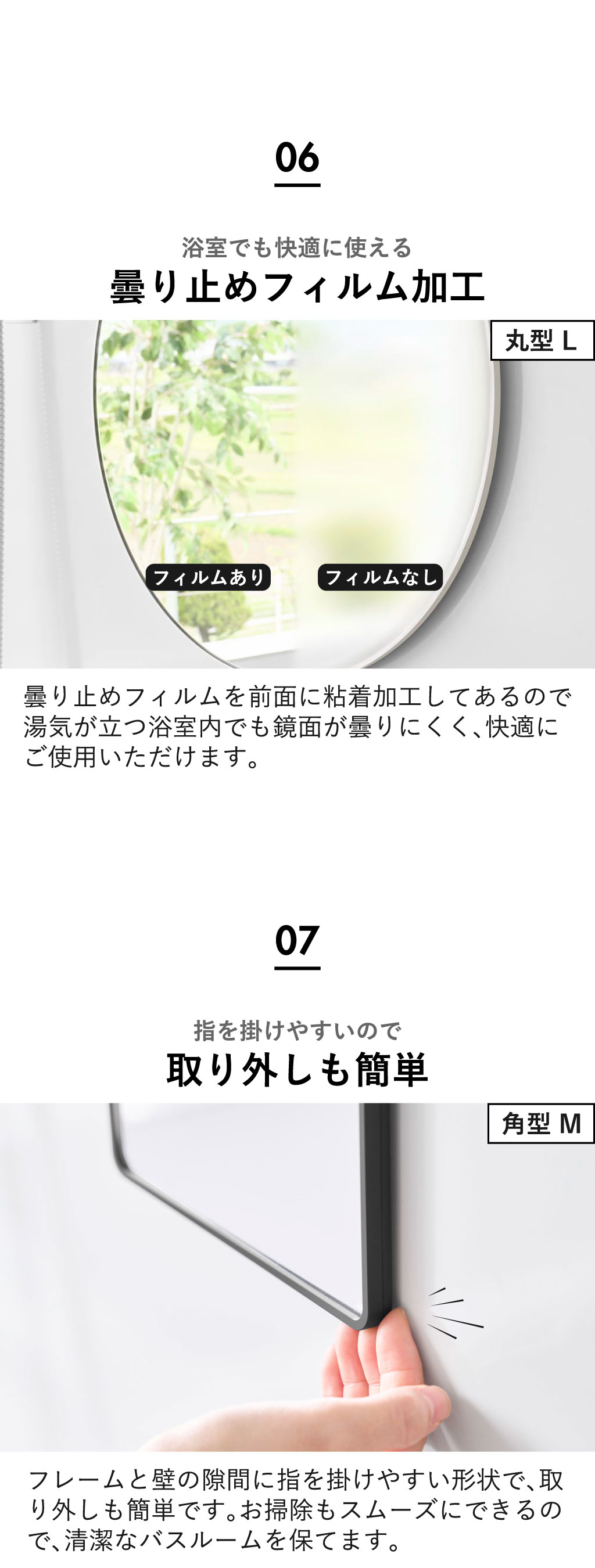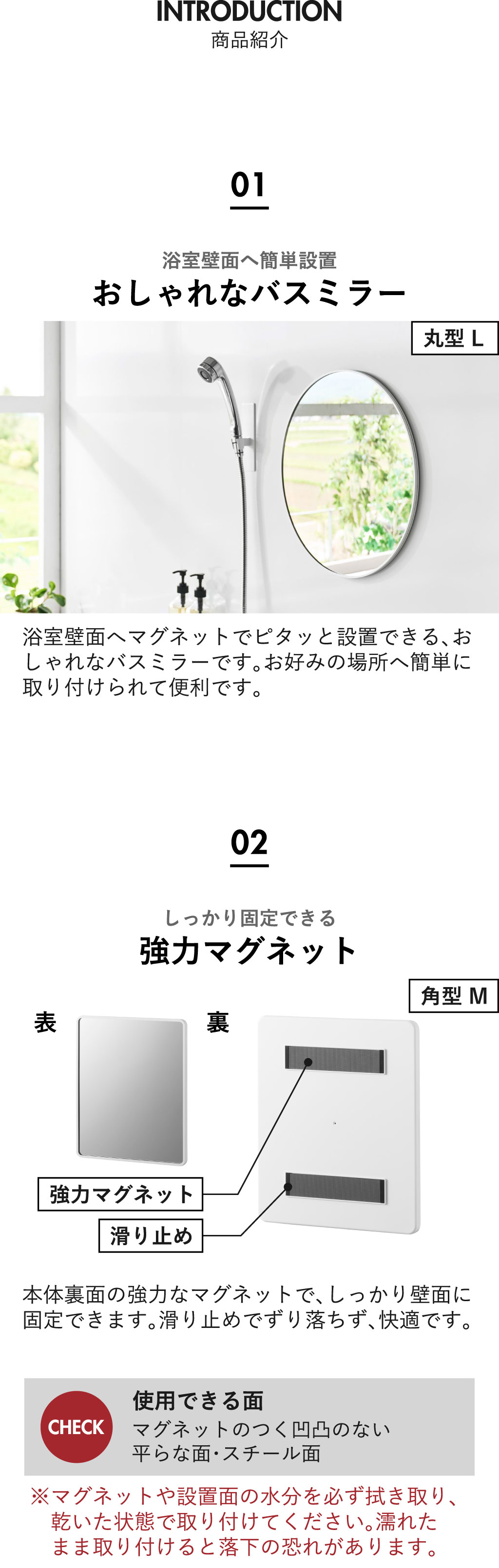 バスルームの雰囲気に合わせて、角型と丸型の2種類からマグネットバスミラーのデザインを