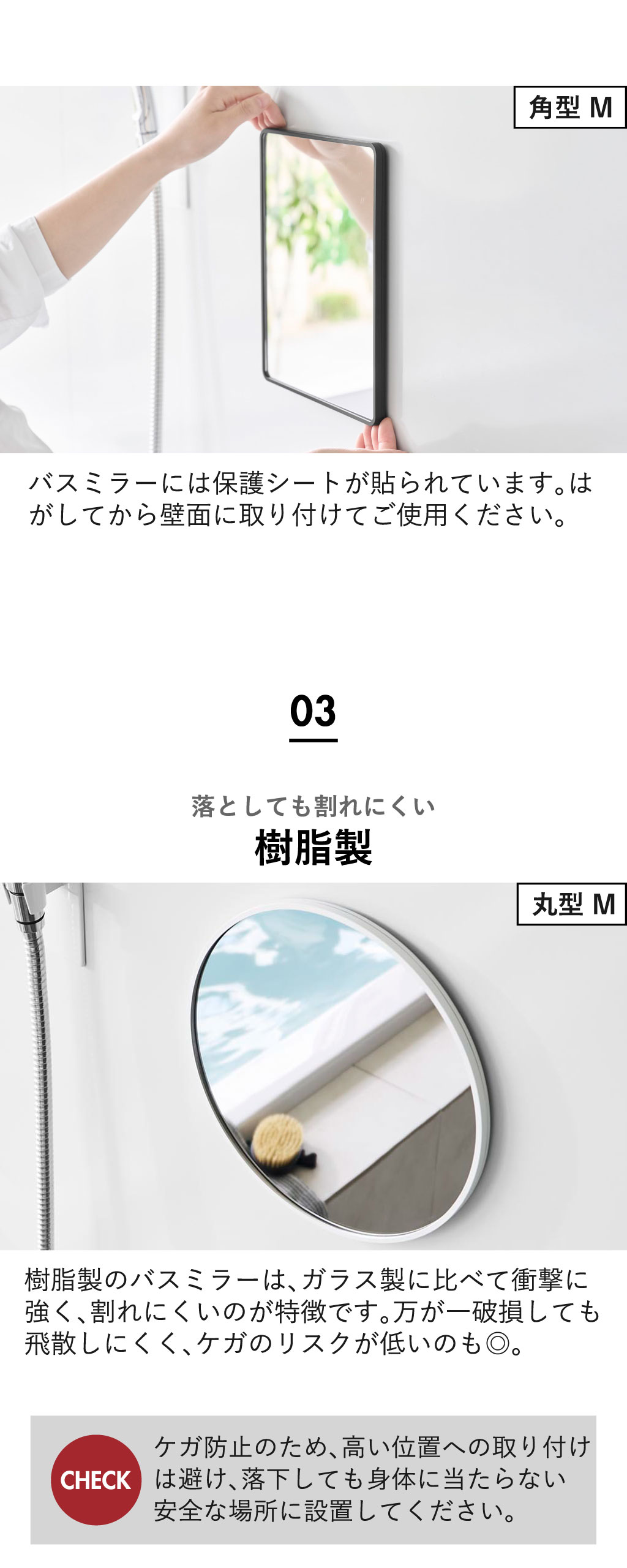 風呂鏡は、落としても割れにくい樹脂製です。ガラスミラーに比べて衝撃に強く、