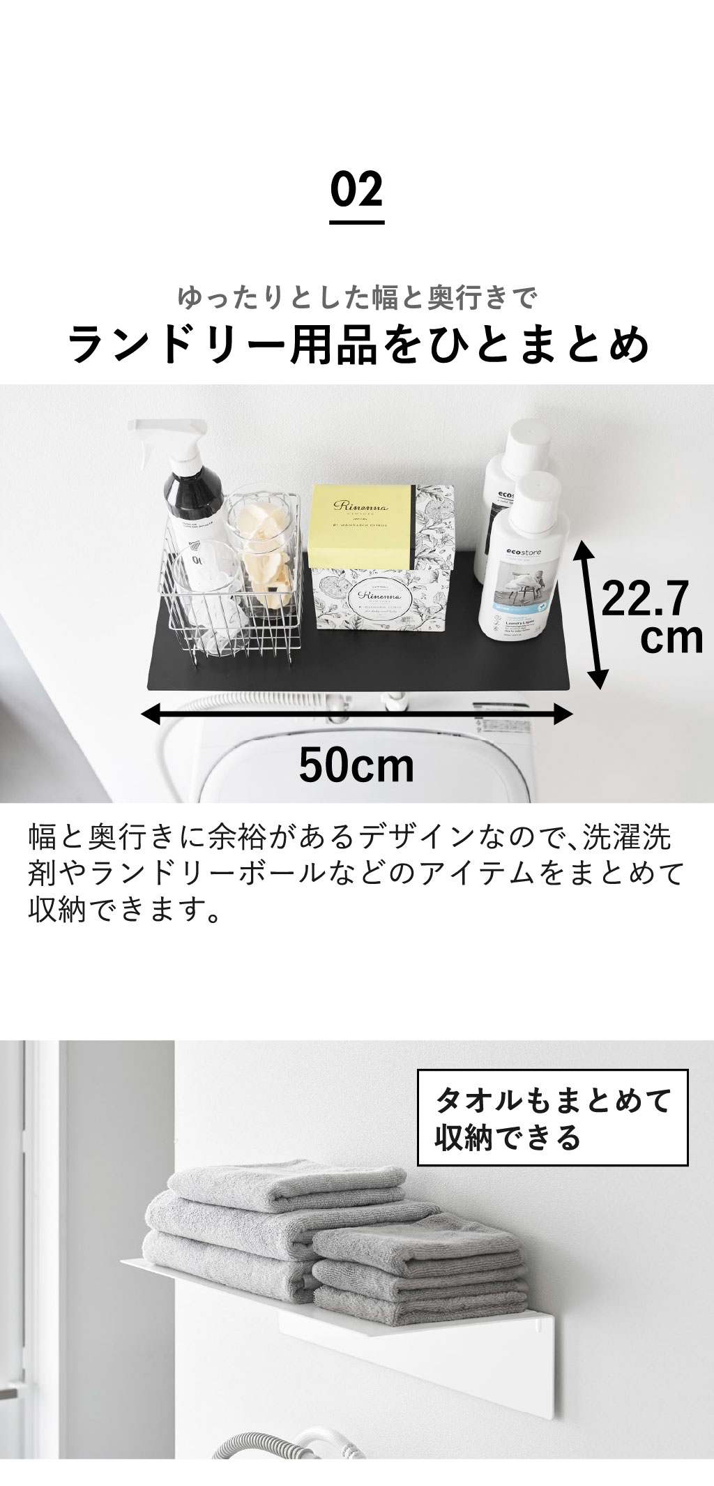タオルやランドリー用品を浮かせて収納することで、場所を取りません。