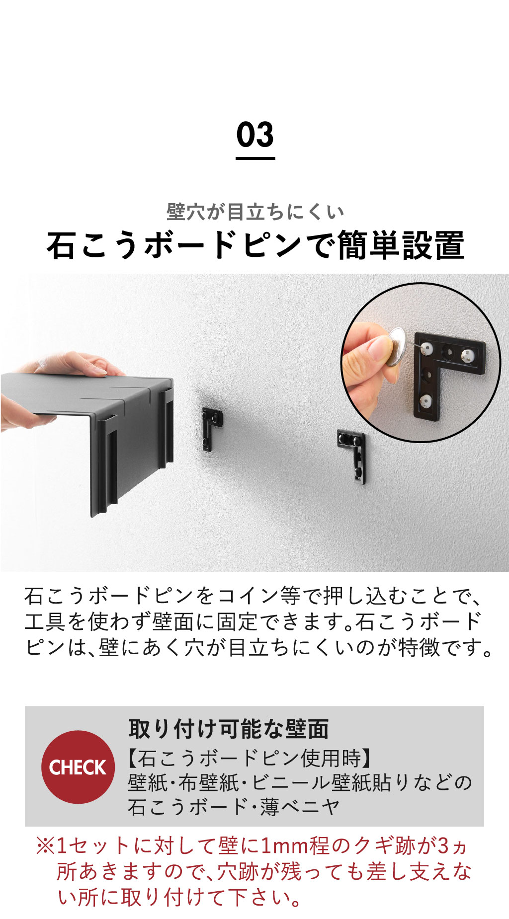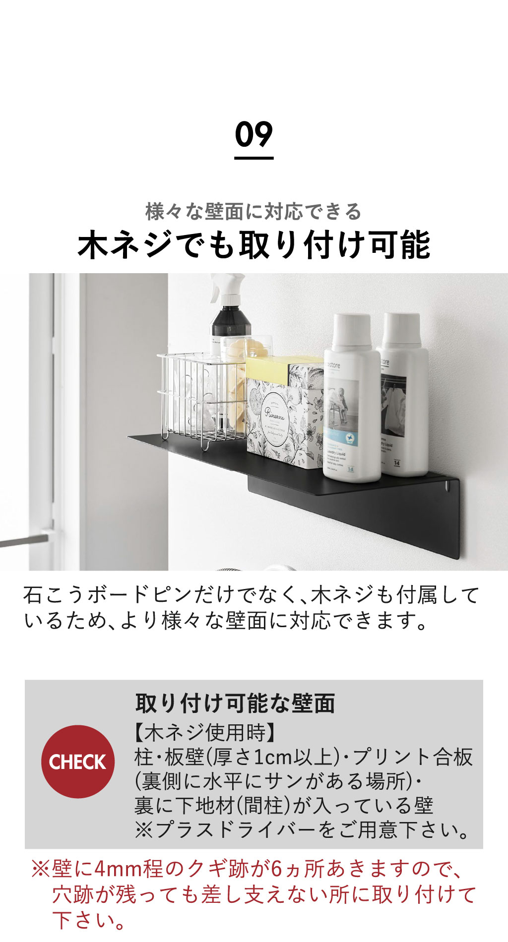 洗濯機上ラックは、壁穴が目立ちにくい石こうボードピンで簡単に設置可能。