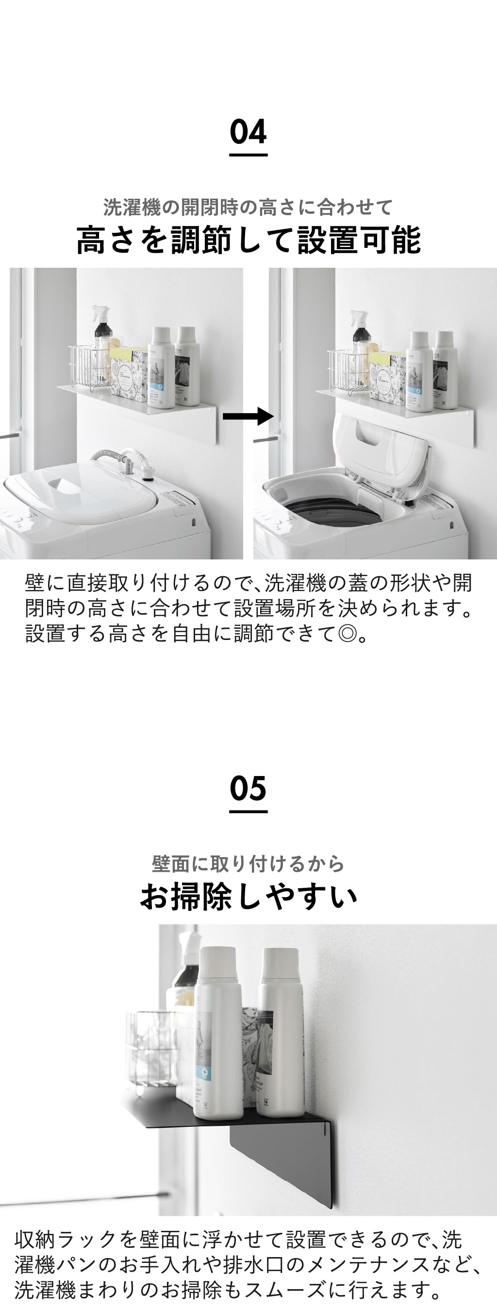 壁に直接取り付けるタイプの収納ラックなので、洗濯機の蓋の開閉を邪魔しない高さに