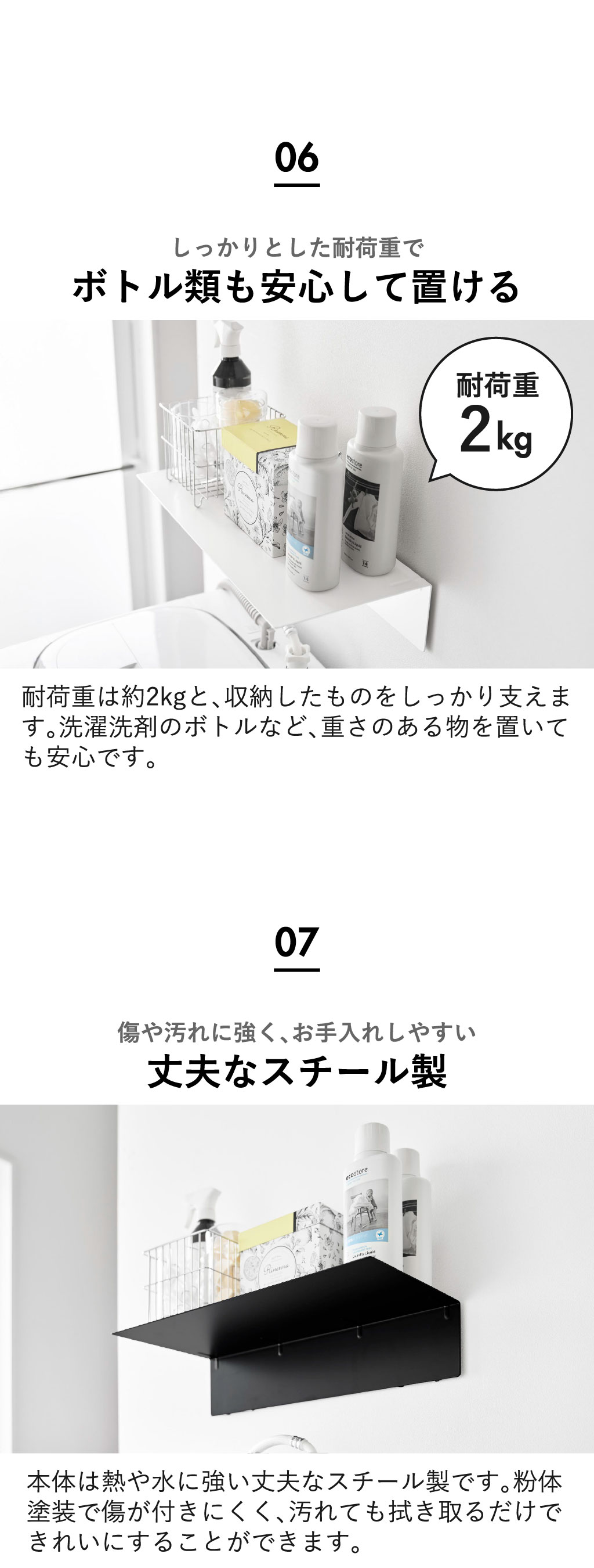 洗濯機上ラックの耐荷重は約2kgと、重さのある洗剤ボトルもしっかり支えます。