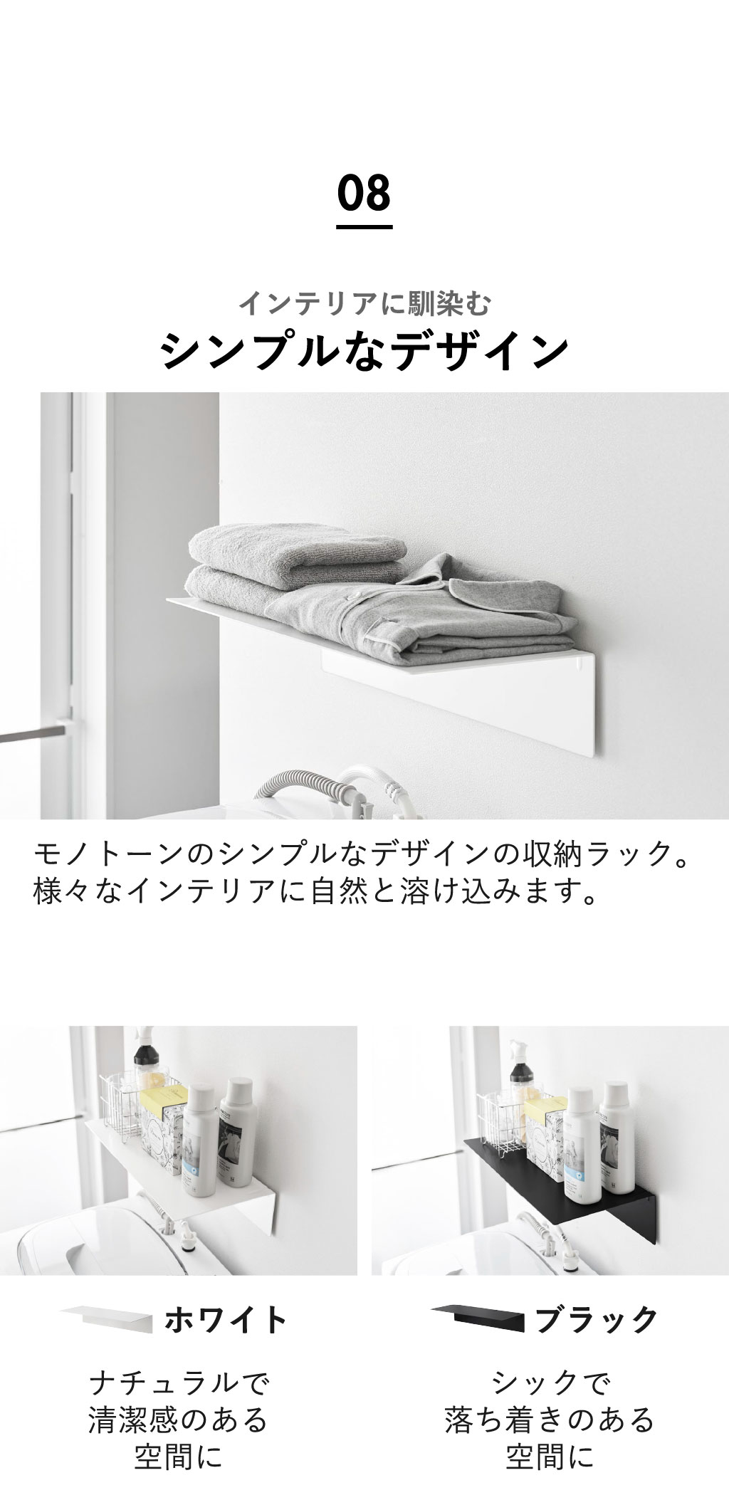 浮かせて設置できる洗濯機上ラックで、ランドリーにゆとりと清潔感を。