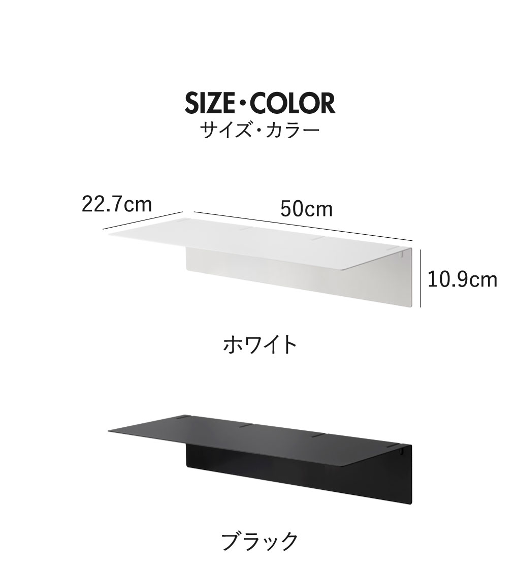 様々なインテリアに溶け込むスリムな壁付け収納ラック。カラーはホワイトとブラックの2色からお選びいただけます。