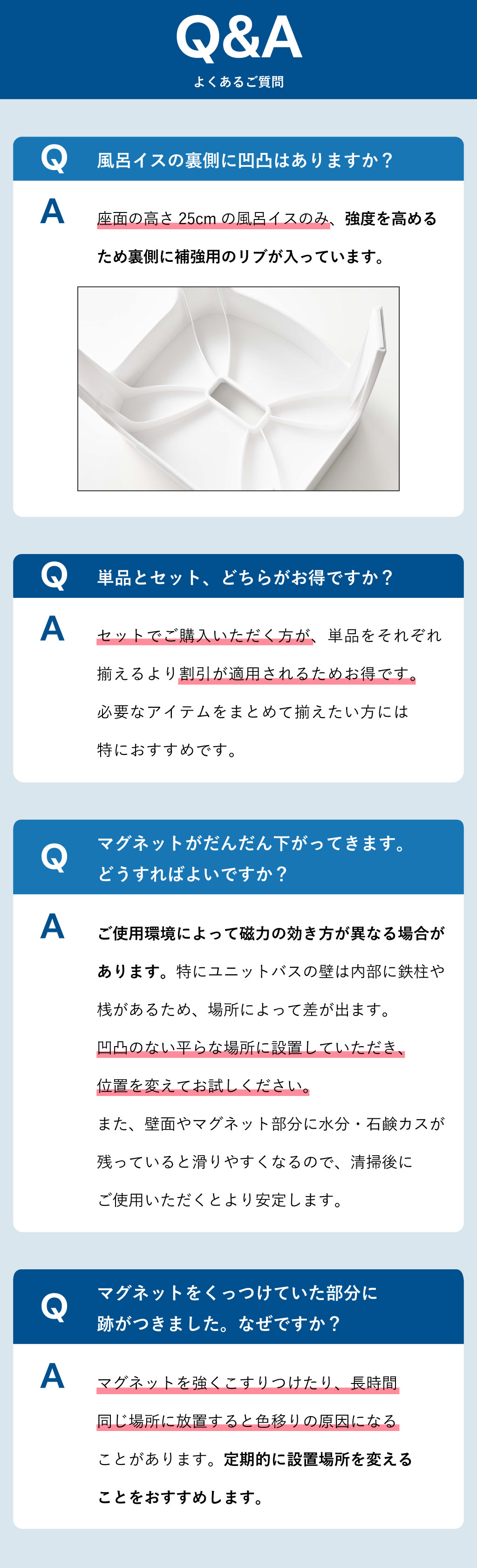 浴室壁面と接する脚にはクッションが付いており、傷がつかず安心です。
