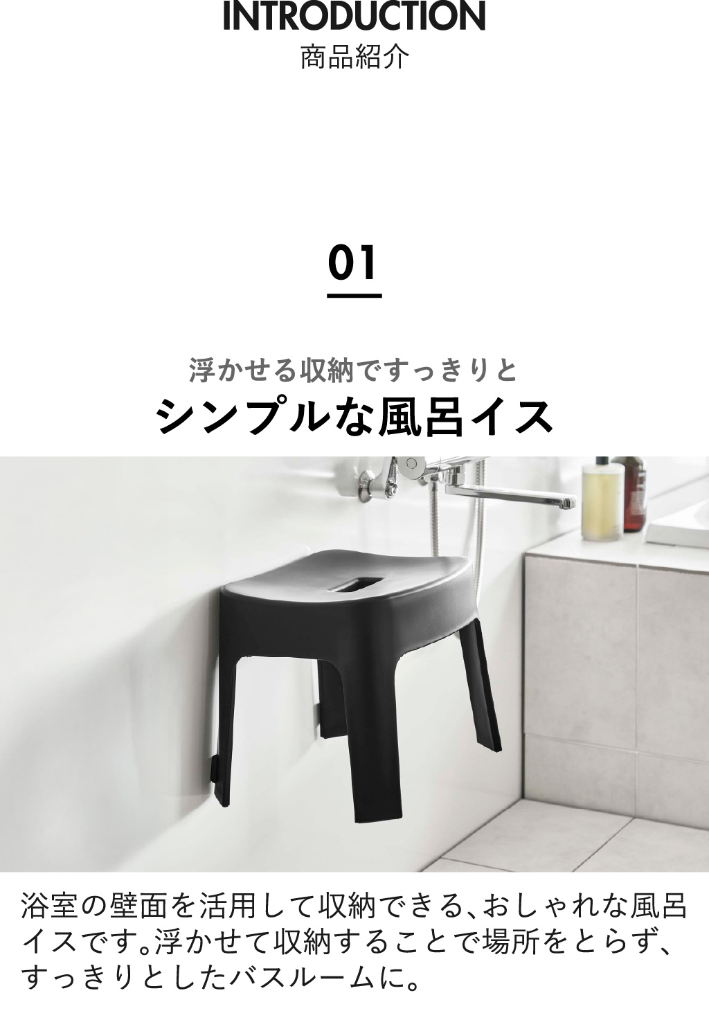 浴室内に浮かせて収納できる、シンプルでおしゃれなお風呂椅子です。