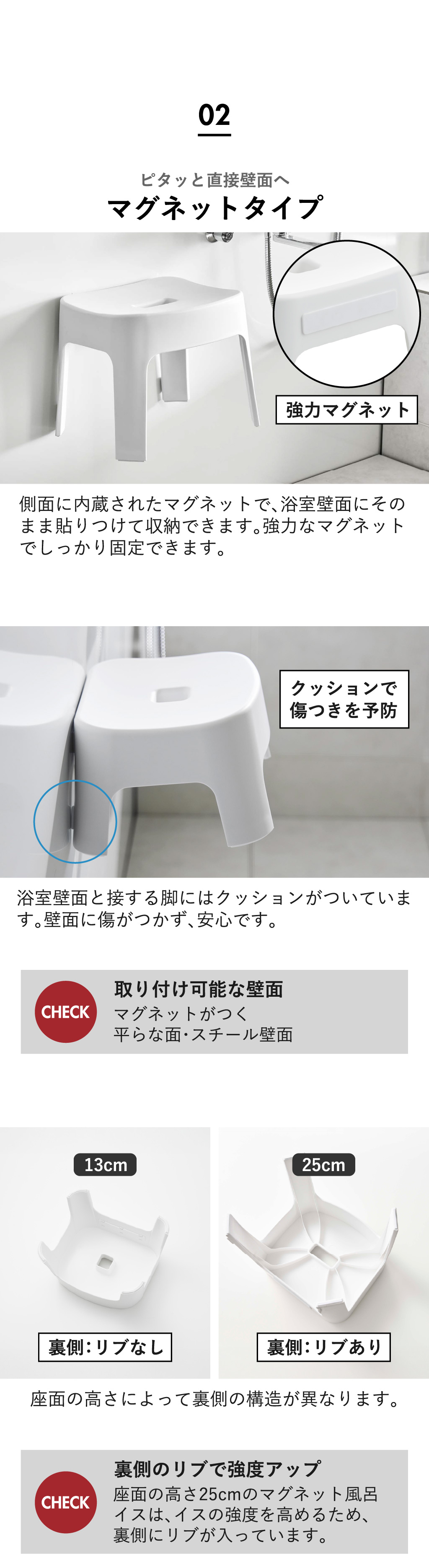 バスチェアをスリムに収納できます。強力なマグネットでずり落ちず、ストレスフリー。