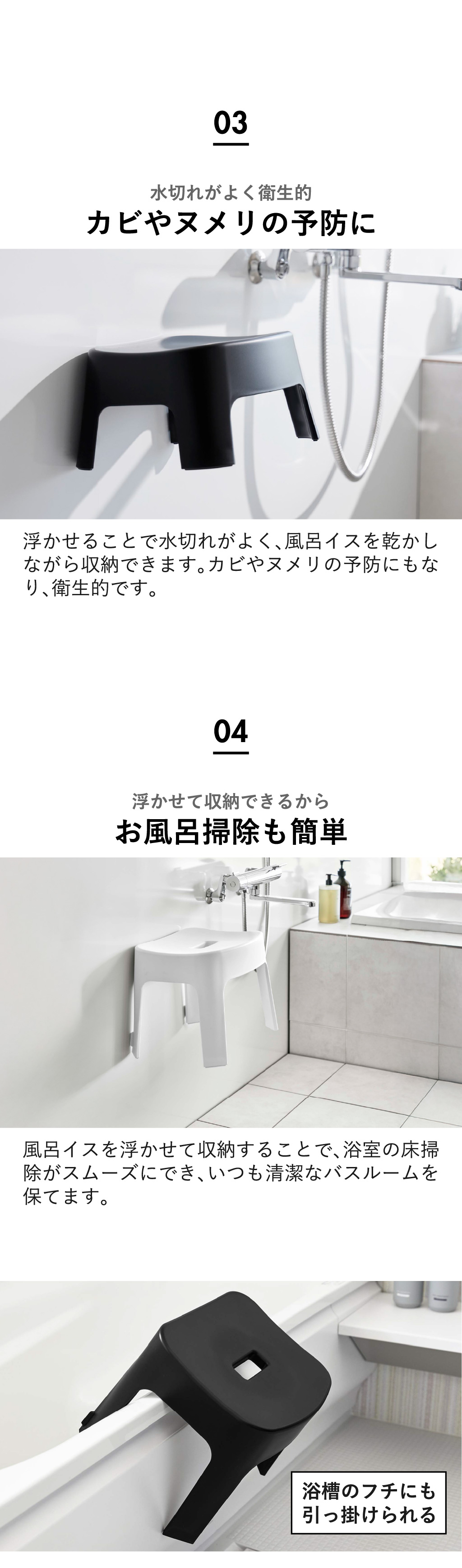 バスチェアをサッと浮かせて収納できるので、毎日のお風呂掃除がスムーズに行えます。