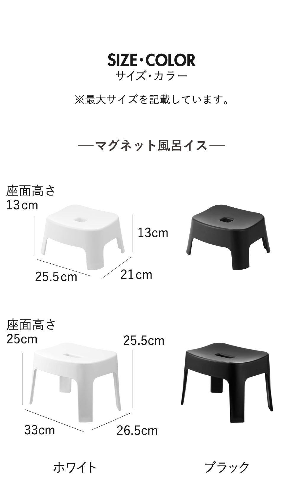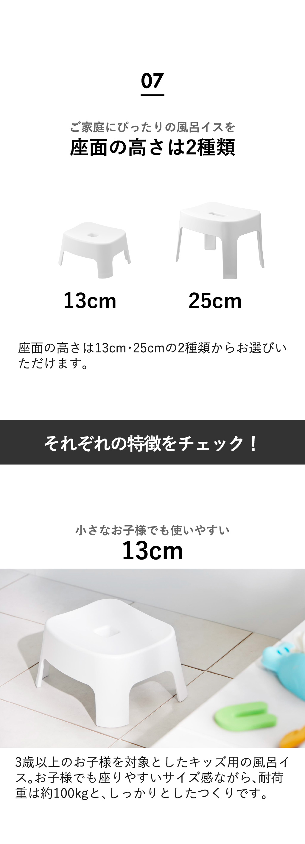 お風呂椅子の座面の高さは、キッズ用の13cm・家族と共用しやすい25cmの2種類。