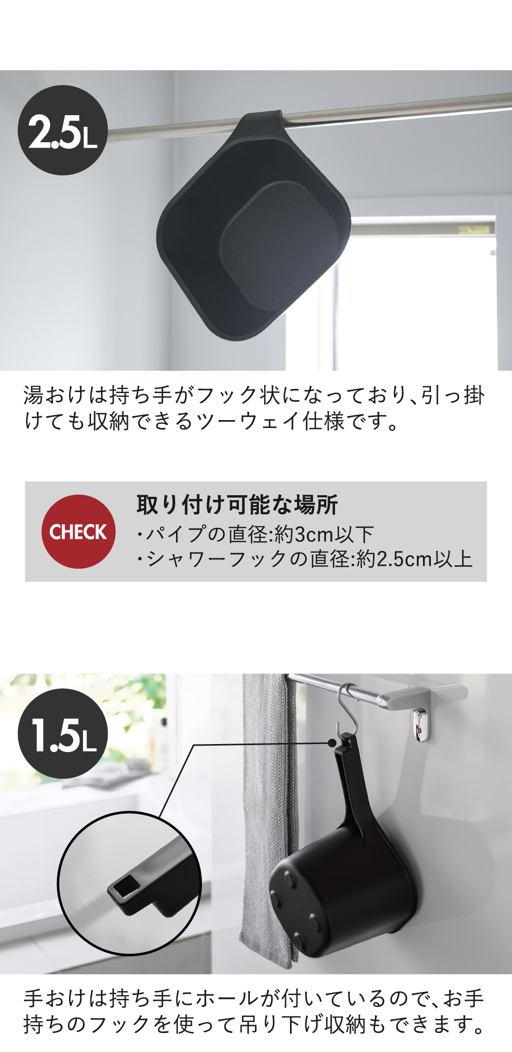 湯おけはパイプに引っ掛けて収納することもできて便利です。