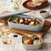 Mサイズは、使い勝手がいい長方形タイプです。鮭の切り身が2切れ入る大きさなので、メイン料理を作るときに便利です。つぶつぶの付いた専用のフタは、加熱した食材から出る旨みを、満遍なく容器全体に行き渡らせるので、蒸し料理が美味しく仕上がります。裏返したフタで魚を焼くこともできるので、幅広い料理を楽しめます。