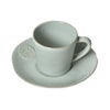 ソーサーにおしゃれなロゴが入っているティーカップ&ソーサー。