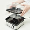 ブラックとシルバーを基調としたデザインで、スクエア型のスリムな設計をしています。 食材を入れる部分は、透明なので食材の色がよく映えて、テーブルを華やかなに演出できます。 1段でも2段でも使えるため、人数によって調整ができ、 またホットプレートのようにいつでも出来立ての料理を食べることができます。