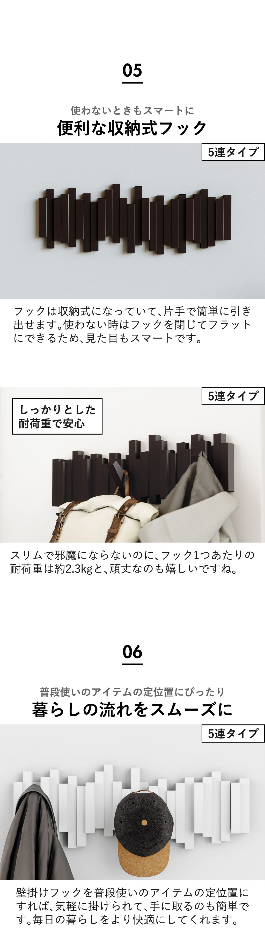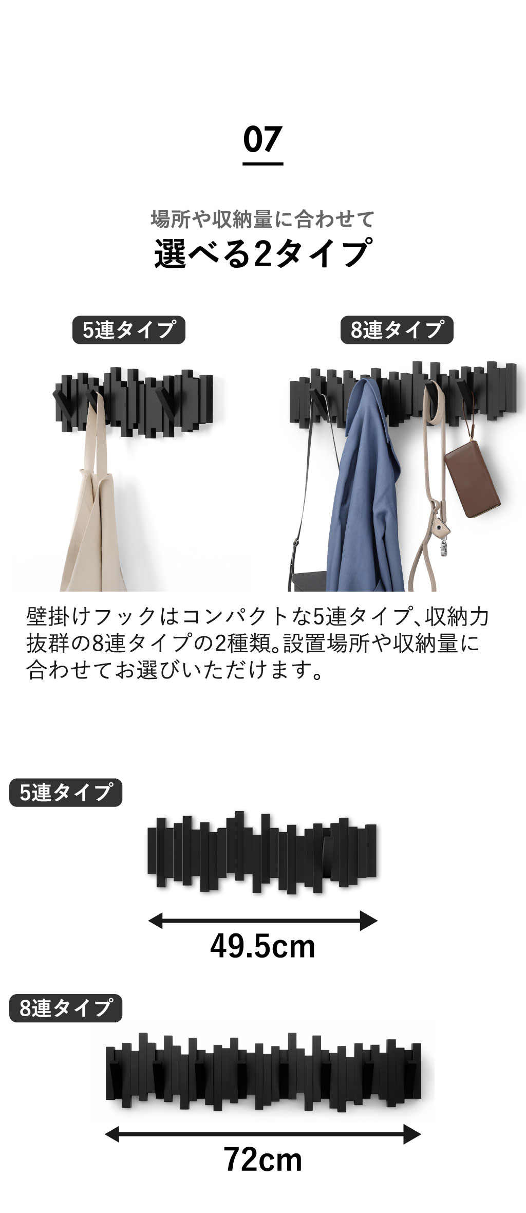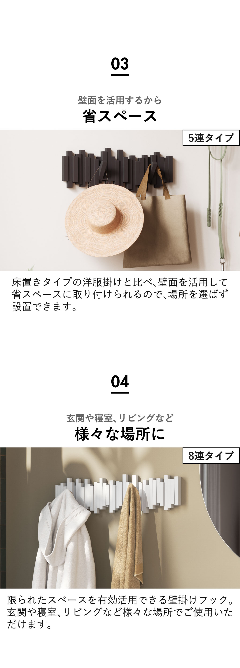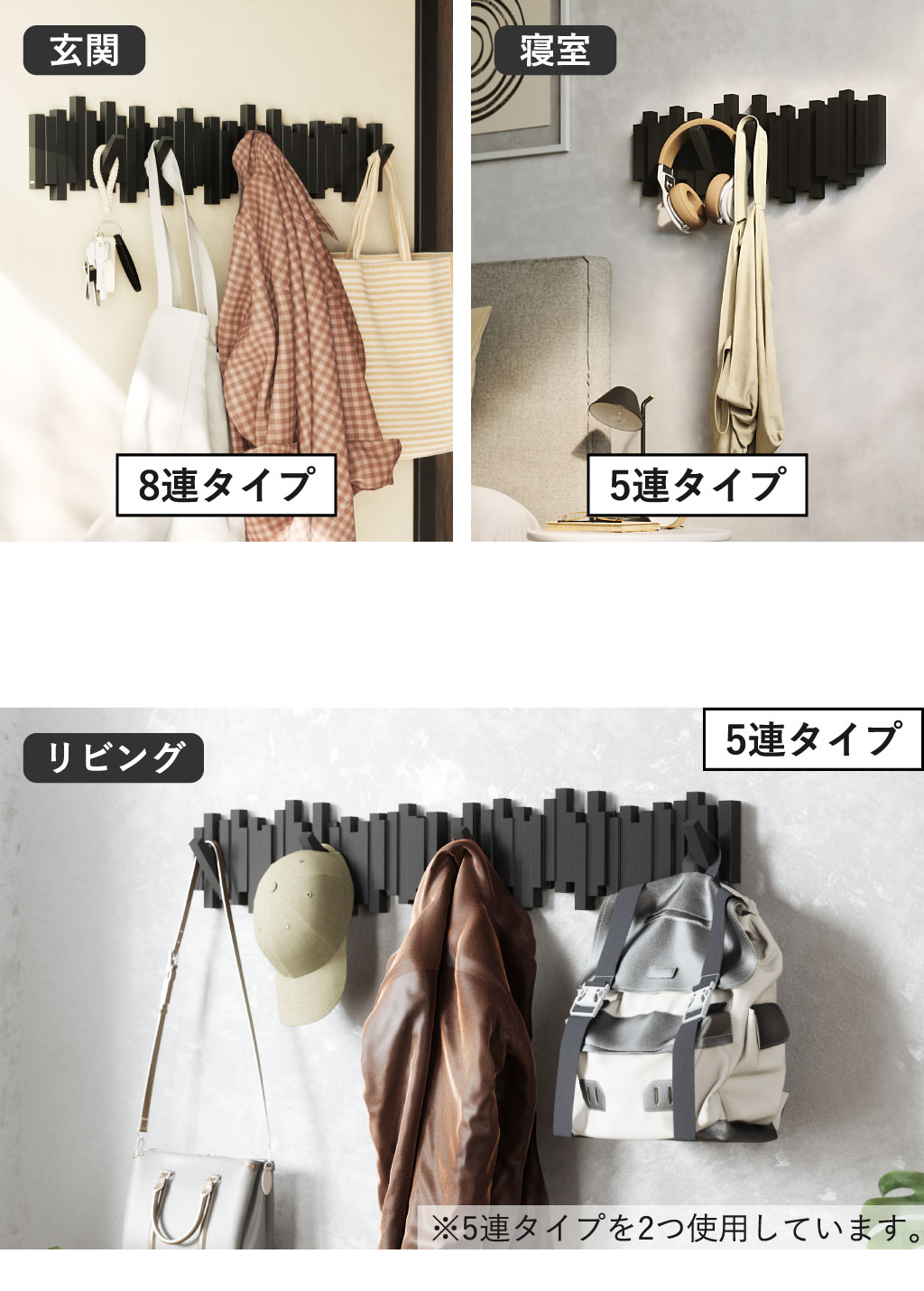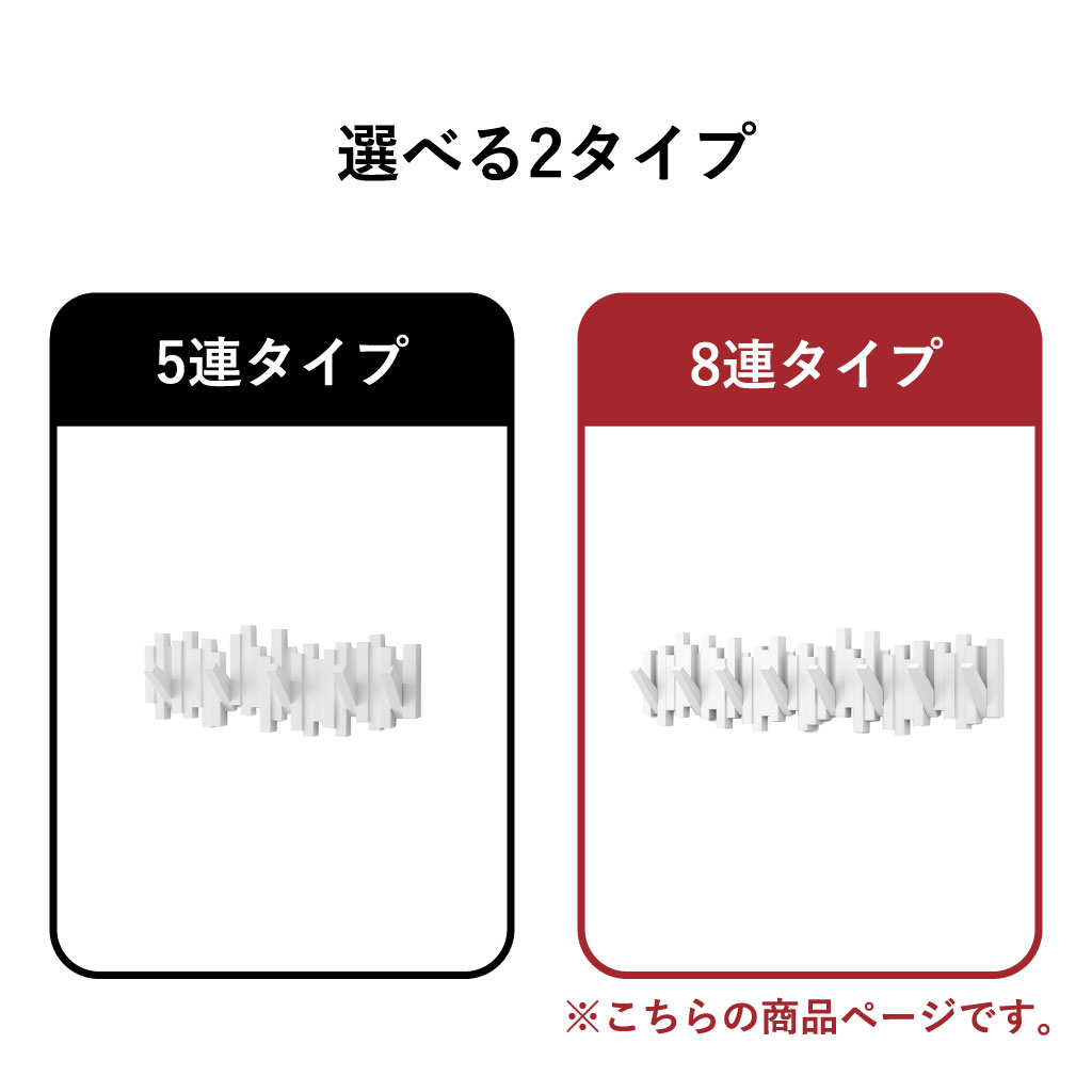 暮らしの流れが整います。壁掛けフックは5連タイプと8連タイプの2種類。