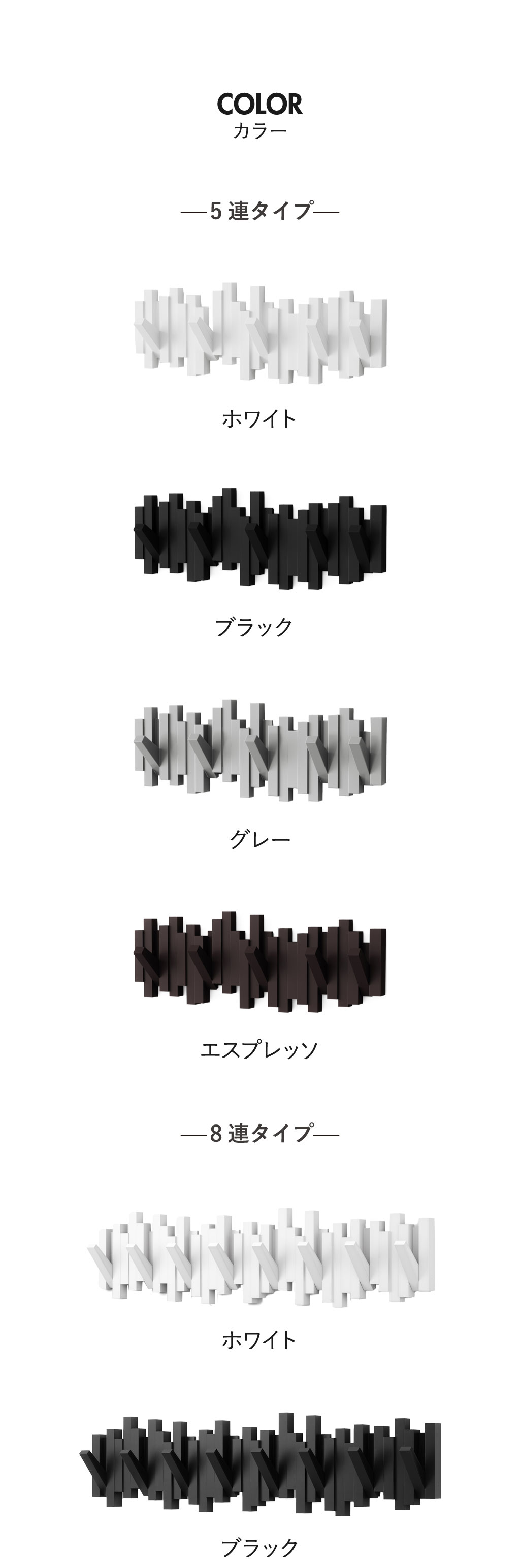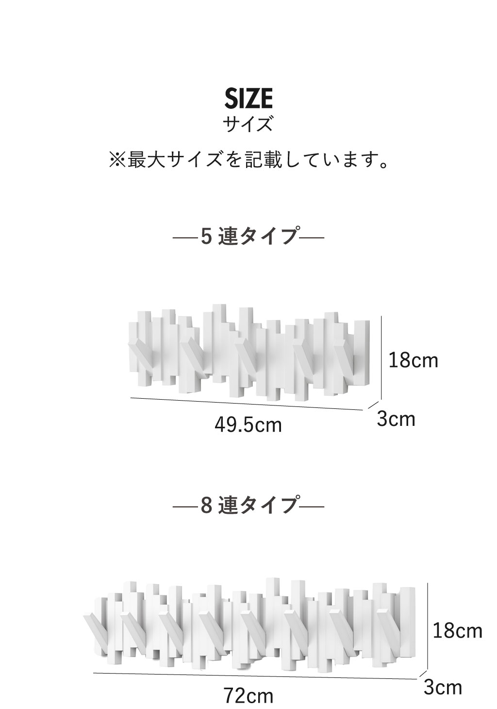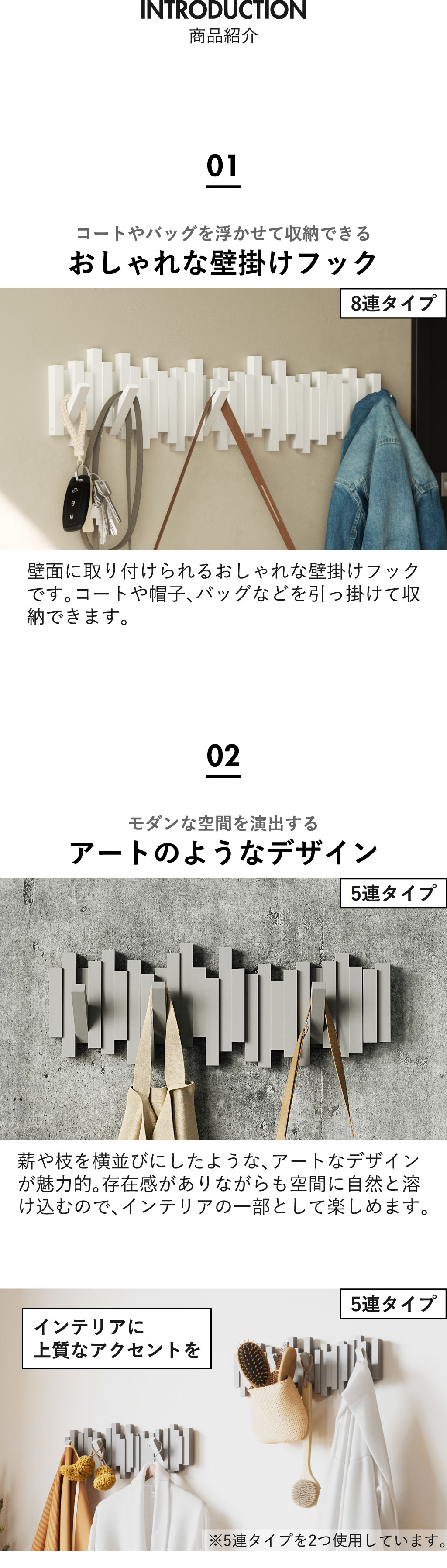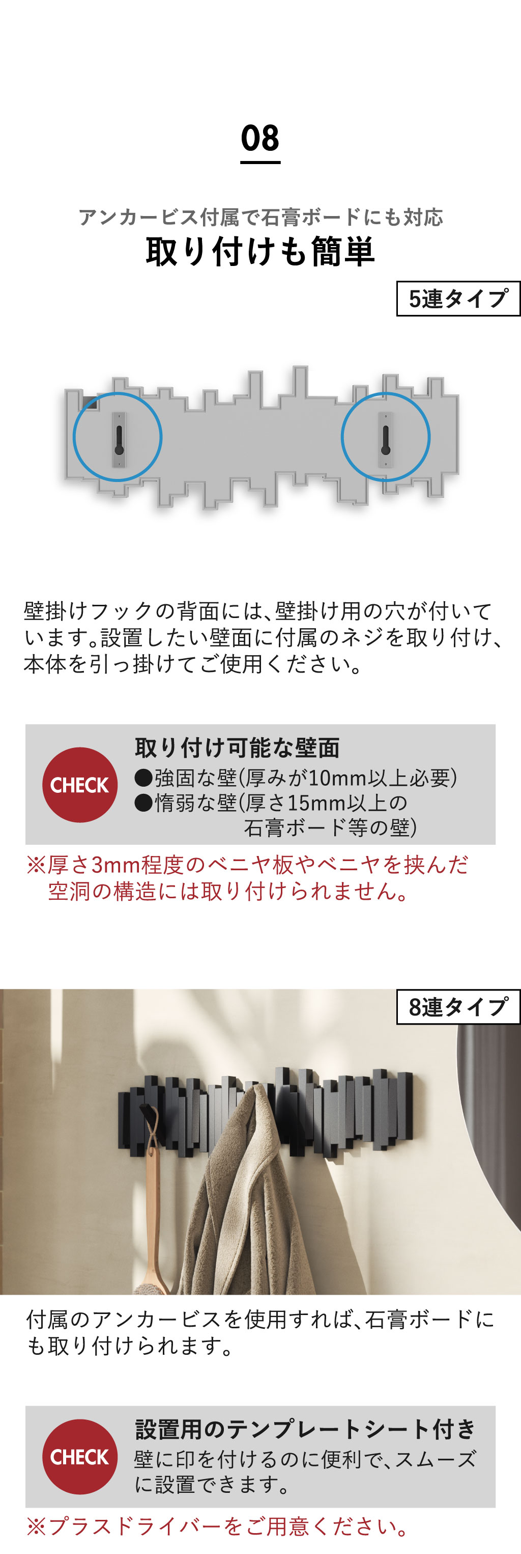 暮らしの流れが整います。壁掛けフックは5連タイプと8連タイプの2種類。