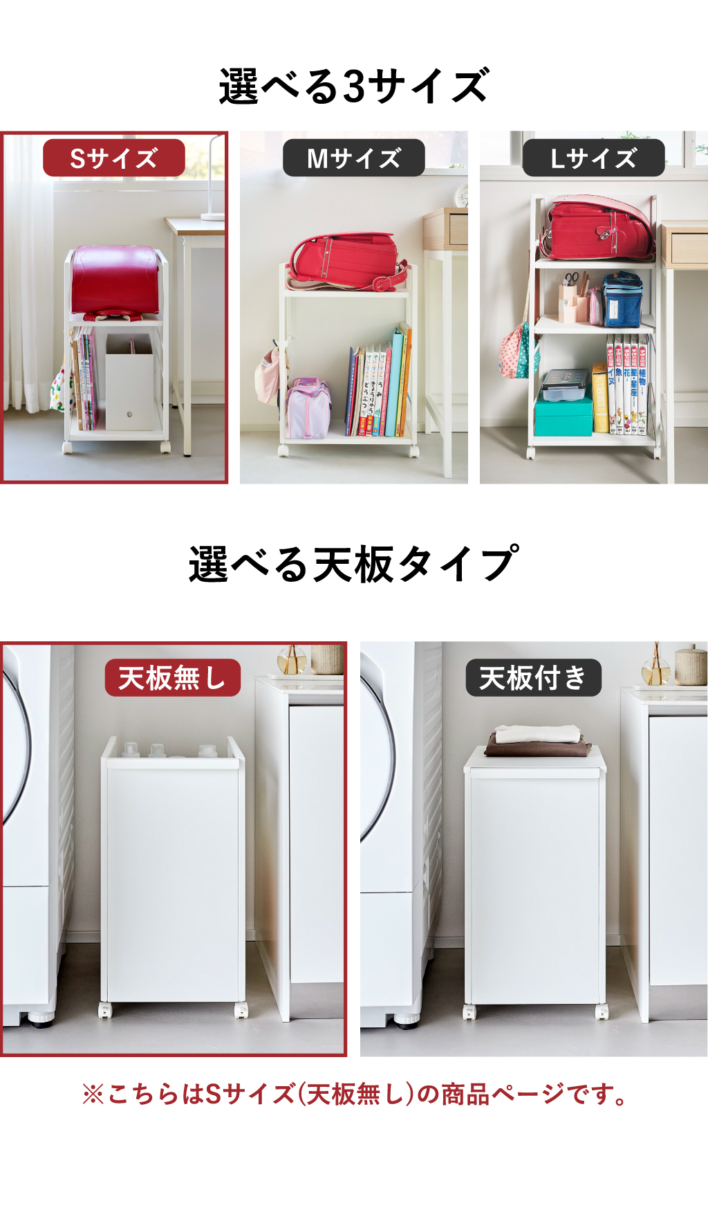 棚が2段のSサイズは、幅33.8cmのスリム設計で、キッチンや洗面所、リビングの隙間に設置可能。