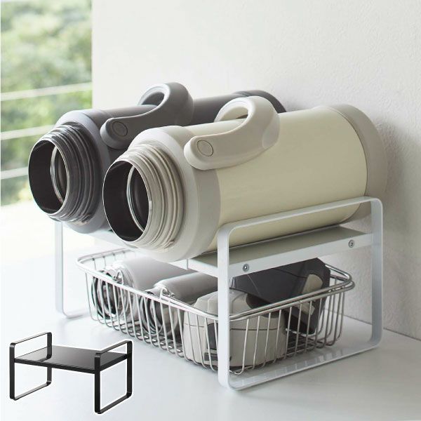 収納したい場所や物に合わせて約幅27~45cmに伸縮可能。カウンター上に置いて、タンブラーやマグボトルなどをまとめて収納できます。お手持ちのバスケットと合わせることで、ふたなどの小物もまとめて収納できるのも嬉しいポイント。