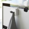 シンク下や洗面台下の扉だけでなく、キッチンの吊り戸棚にも設置可能。背面のフックを棚板に差し込むことで、戸棚下のデッドスペースを活かしつつ、タオルを浮かせて掛けることができます。