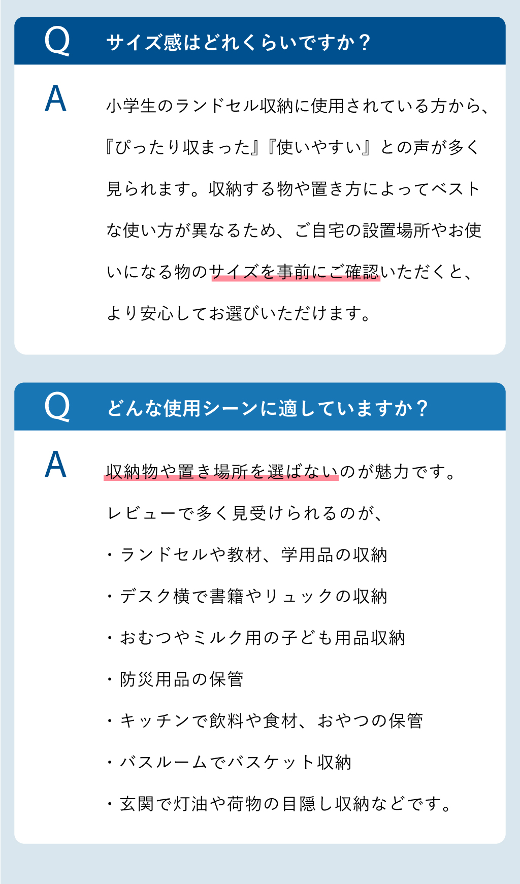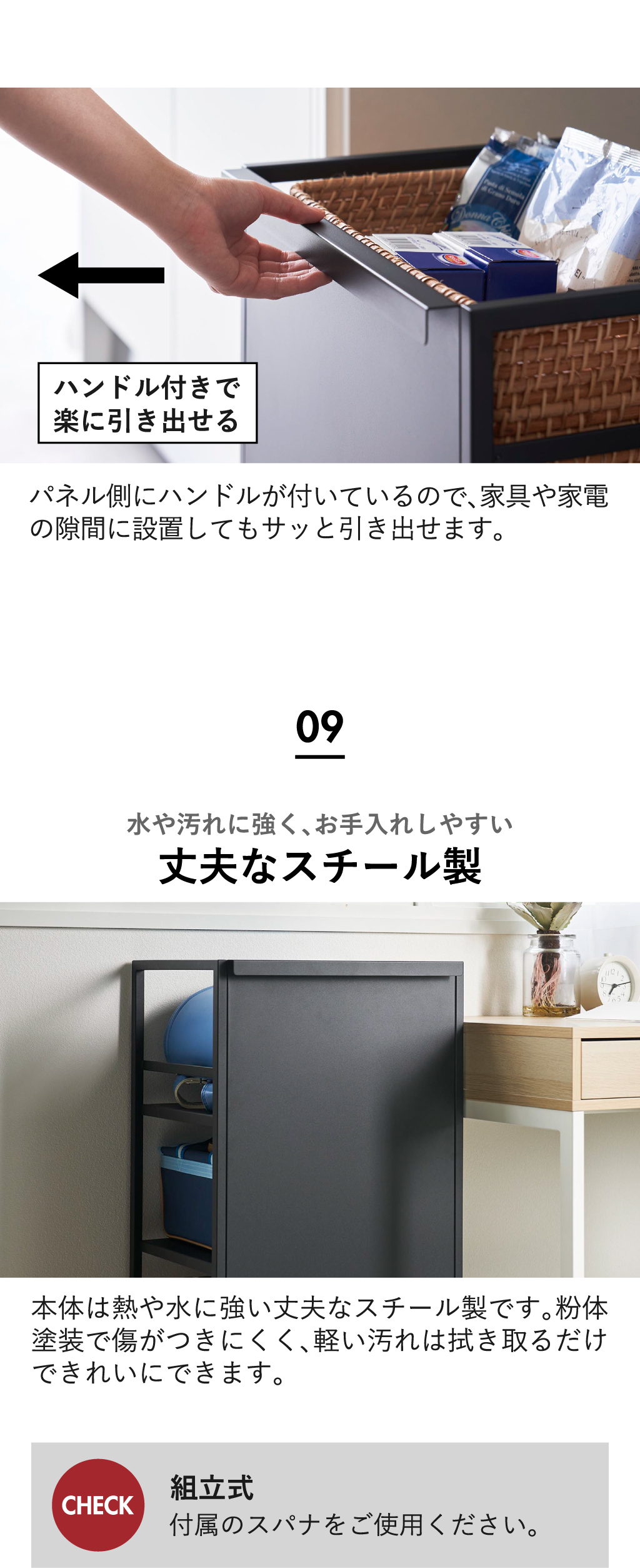 前面は目隠し仕様になっているので、生活感を隠して収納できます。