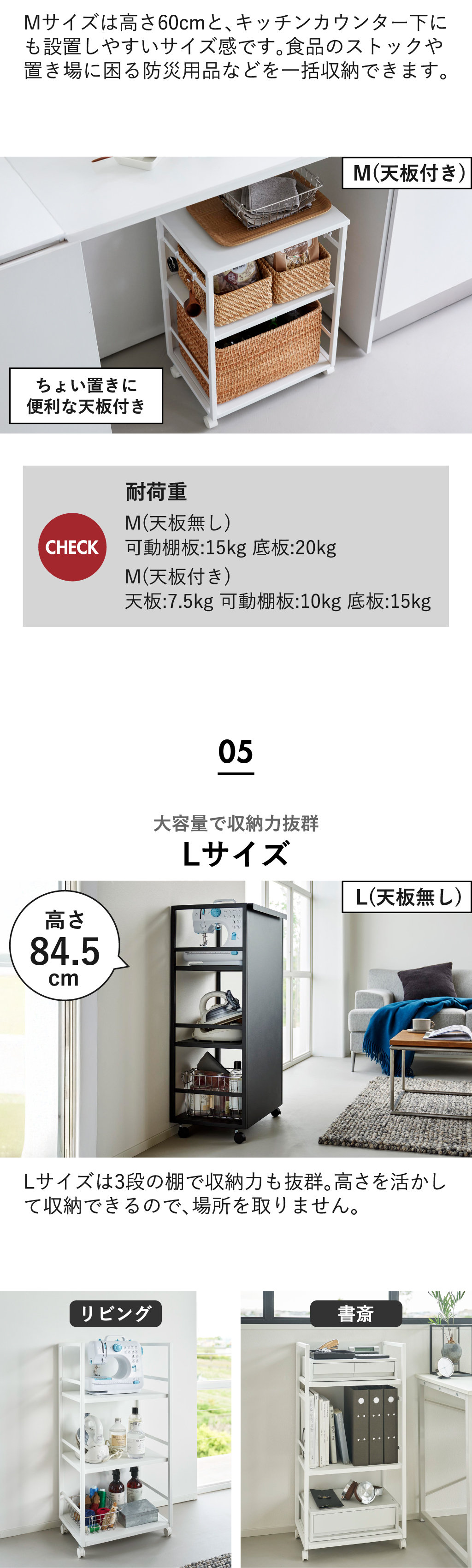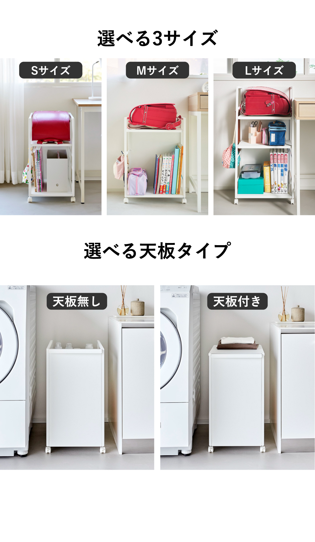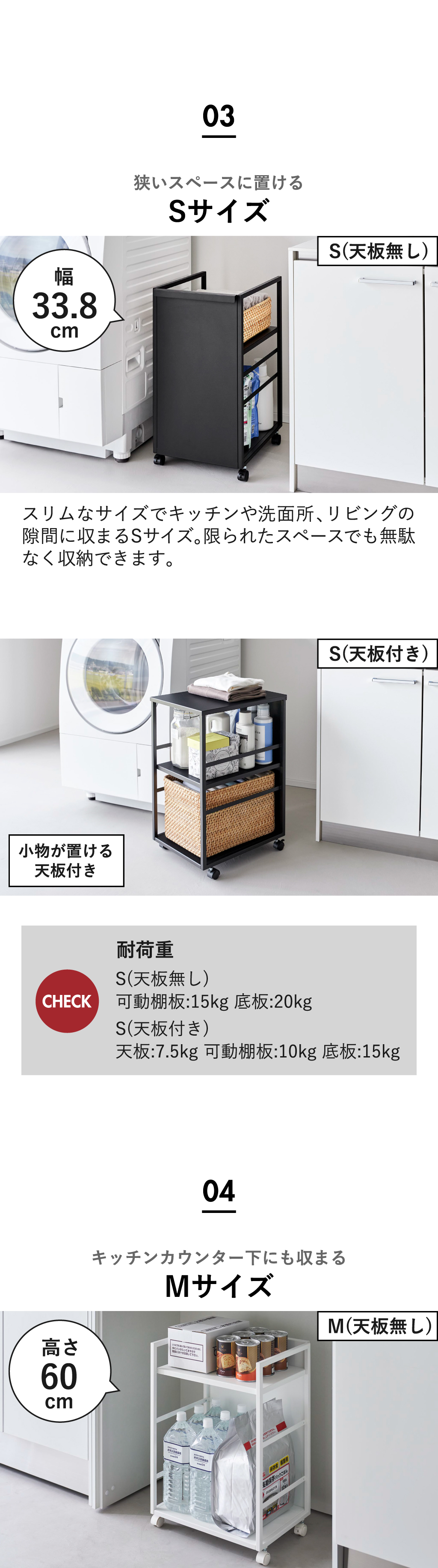 棚が2段のSサイズは、幅33.8cmのスリム設計で、キッチンや洗面所、リビングの隙間に設置可能。