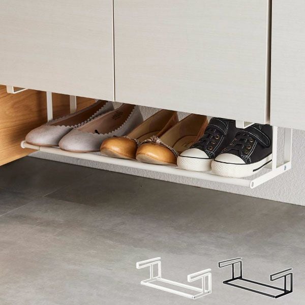 玄関の下駄箱に差し込んで設置できる、省スペースなシューズラックです。下駄箱下の空間を活かして、よく履く靴の一時収納や、一日履いた靴や雨に濡れた靴の風通しとして活躍。その下に靴を収納すれば、ごちゃつきな玄関が更にすっきりします。