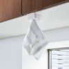 シンク下や洗面台下の扉だけでなく、キッチンの吊り戸棚にも設置可能。背面のフックを棚板に差し込むことで、戸棚下のデッドスペースを活かしつつ、タオルを浮かせて掛けることができます。