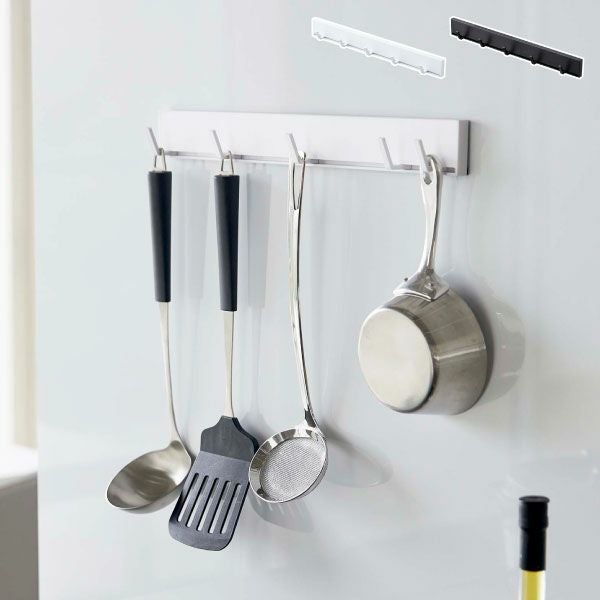 磁石のくっつく壁面に、ぴたっと設置できる収納フックです。冷蔵庫やスチールパネルに取り付けて、お玉やフライ返しなどのキッチンツールをひとまとめに収納。置き場に困りがちなごちゃつくキッチンツールを、すっきり収納してくれます。