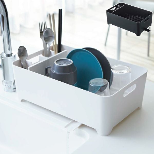 シンク上に設置できる、シンプルでおしゃれな水切りかごです。洗い終わった食器やカトラリー、調理道具をまとめて水切りできます。バスケットタイプなので、オープンタイプのキッチンに置いても見た目はすっきり。ちょっとした目隠しにもなります。