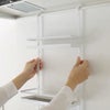 コンロ上の空間に設置できる調味料ラックです。収納力抜群の3段タイプで、種類が多くごちゃつきがちな調味料やスパイスをひとまとめに収納してくれるから、すっきりしたキッチン周りに。お揃いのボトルに詰め替えて美しく並べれば、「見せる収納」としても◎。