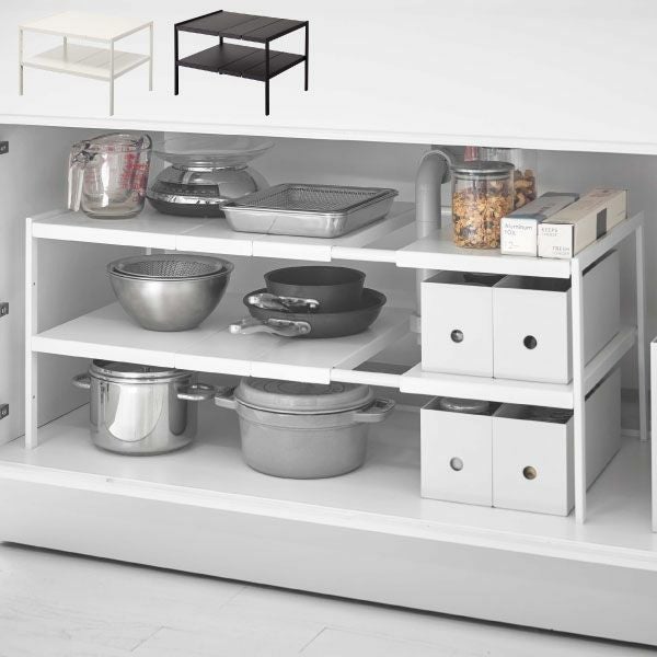 シンク下を快適な収納スペースにしてくれる、伸縮機能付きのラックです。スリムなフレームで構成されたシンプルデザインで、収納したものを美しくみせてくれます。