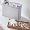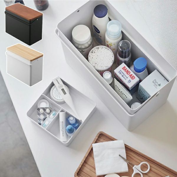 絆創膏や消毒液、爪切りなどの衛生用品から体温計や常備薬まで、1か所に収納することができます。身の回りでよく使うものを、ひとまとめて置くことができて便利です。上段には小分けにした錠剤や目薬などの小物の収納に便利なトレー付き。
