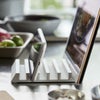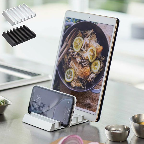 複数のデバイスをまとめて収納できる、おしゃれなタブレットスタンドです。スマートフォンやタブレットをスタイリッシュに収納。レシピを見ながらの調理や、動画の視聴、充電するときなど幅広く活躍してくれます。色は、ホワイトとブラックの2色からお選びいただけます。