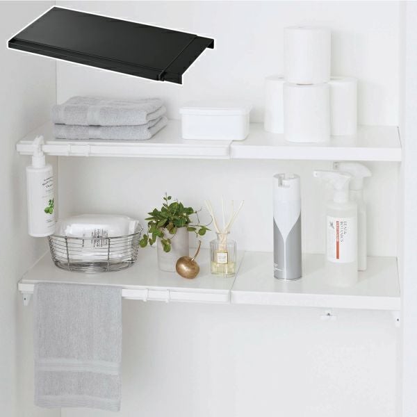 棚板はつっぱり棚の上にも取り付けられます。スリット状、網目状のつっぱり棚もフラットになるので、細かい小物や倒れやすいボトルも安定して乗せられます。