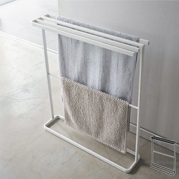 無駄のない、洗練されたデザインが魅力的なバスタオルハンガーです。下段にはバスマットなどを干せるバーが付いています。シンプルなので様々な空間に自然と溶け込みます。