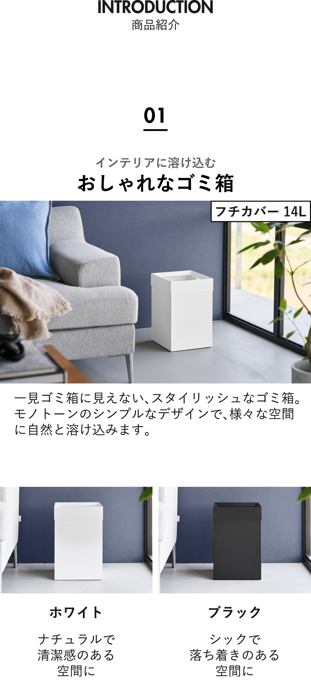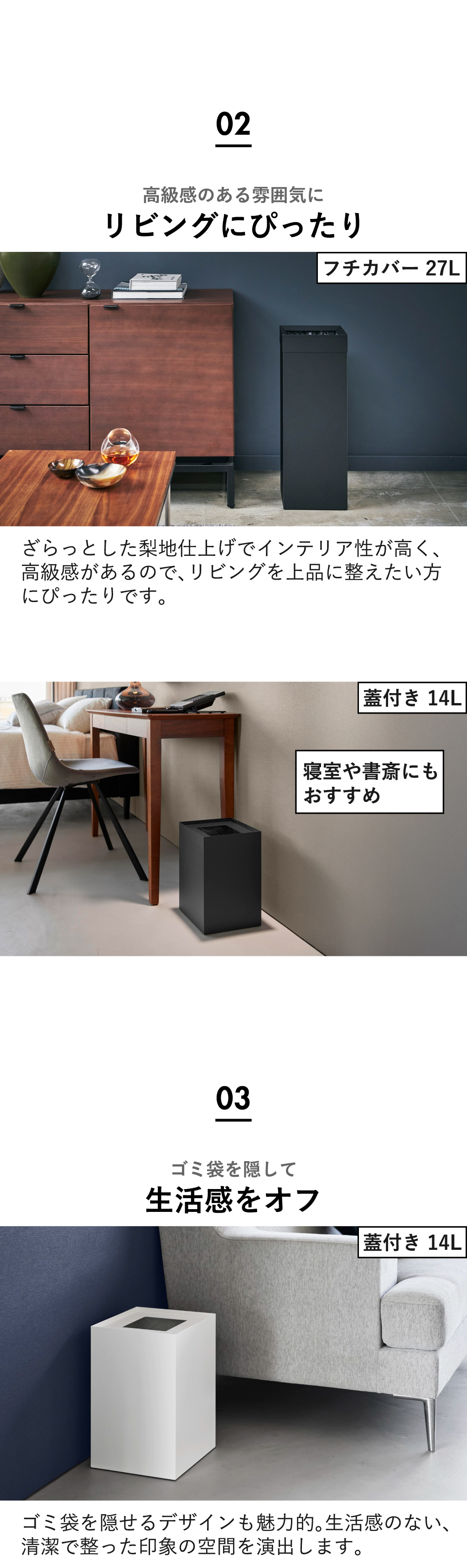 ゴミ箱の容量はコンパクトな14Lと大容量の27Lをご用意しました。