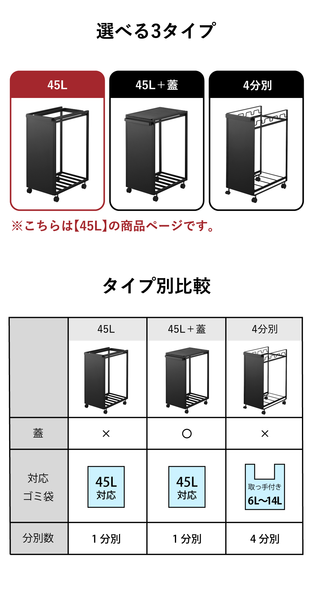 45l/45L+蓋は45L・45リットル対応、4分別はレジ袋対応のゴミ箱として、