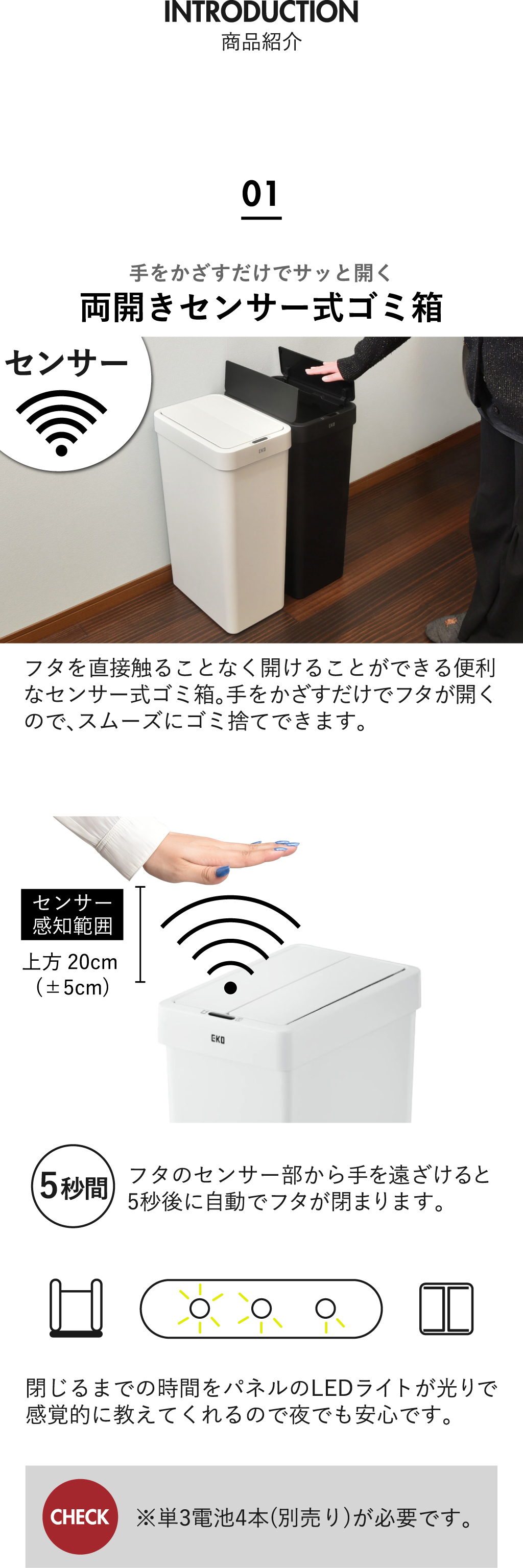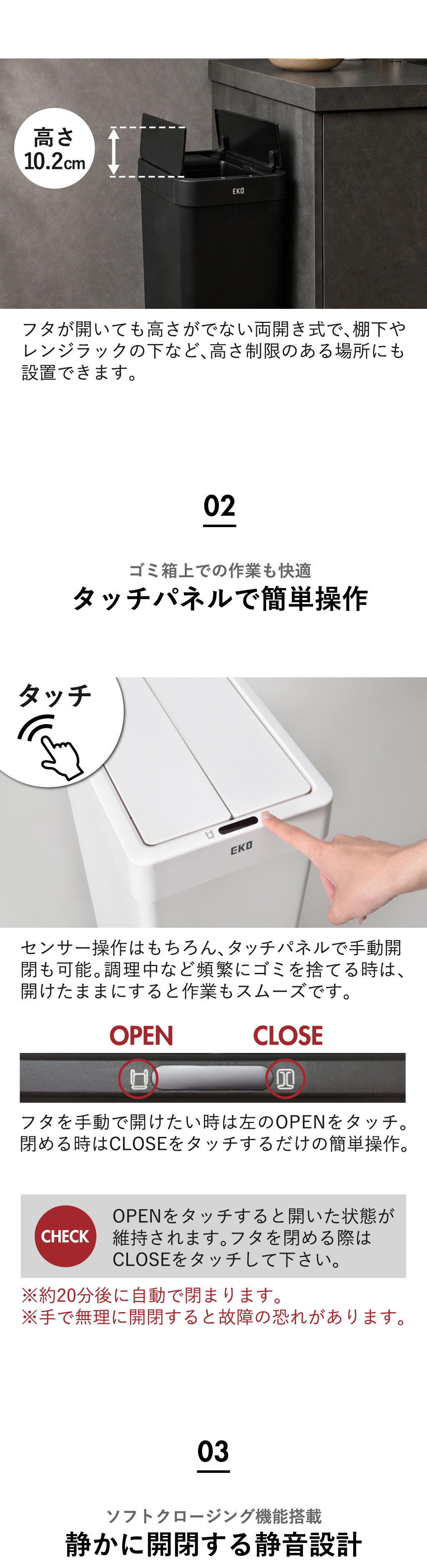 自動開閉式ゴミ箱は、フタが開いても高さがでない両開き式で、