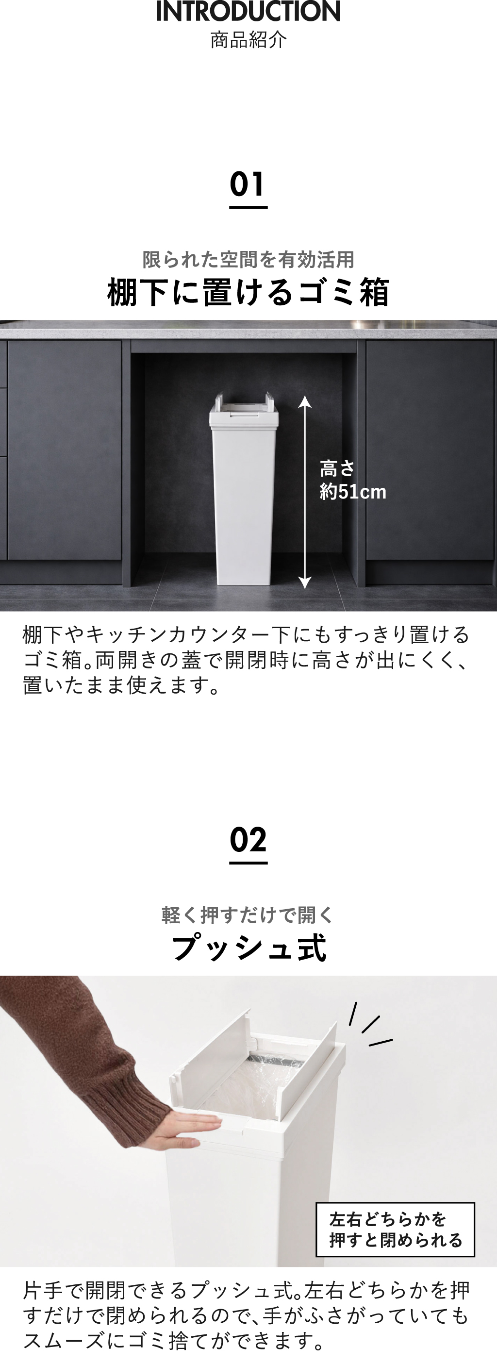 片手で開閉できるプッシュ式ふた付きゴミ箱は、左右どちらかを押すだけで
