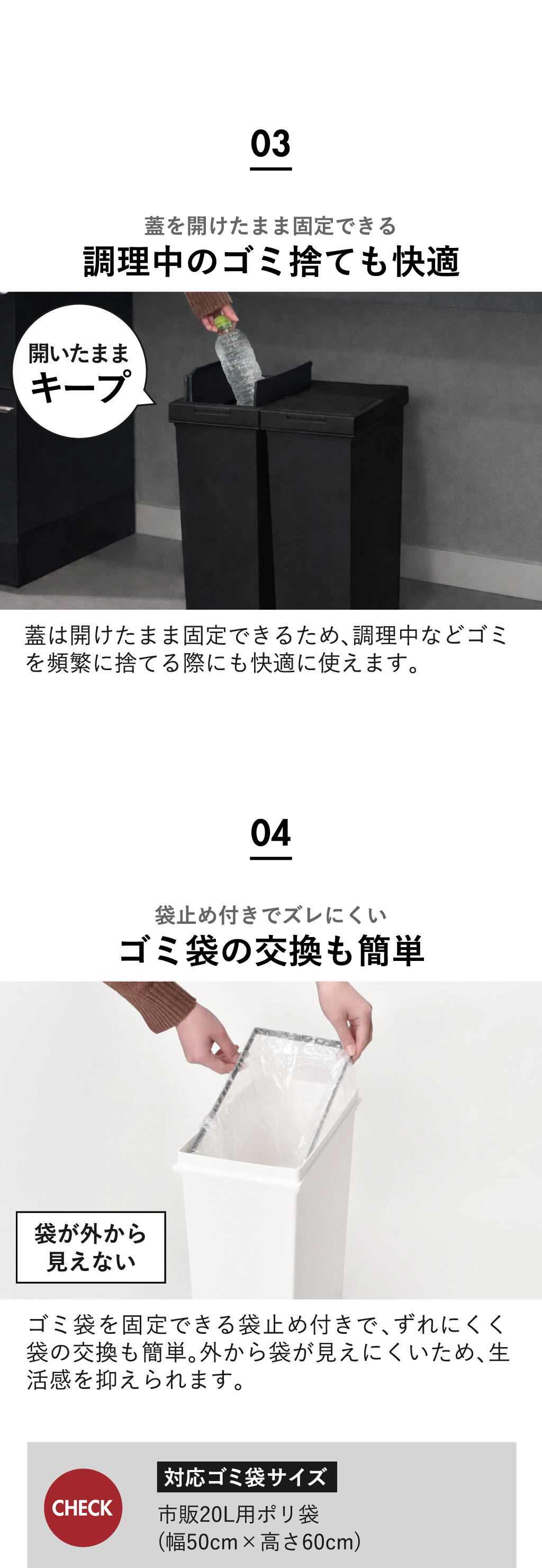 閉められるため、手がふさがっていてもスムーズにゴミ捨てができます。
