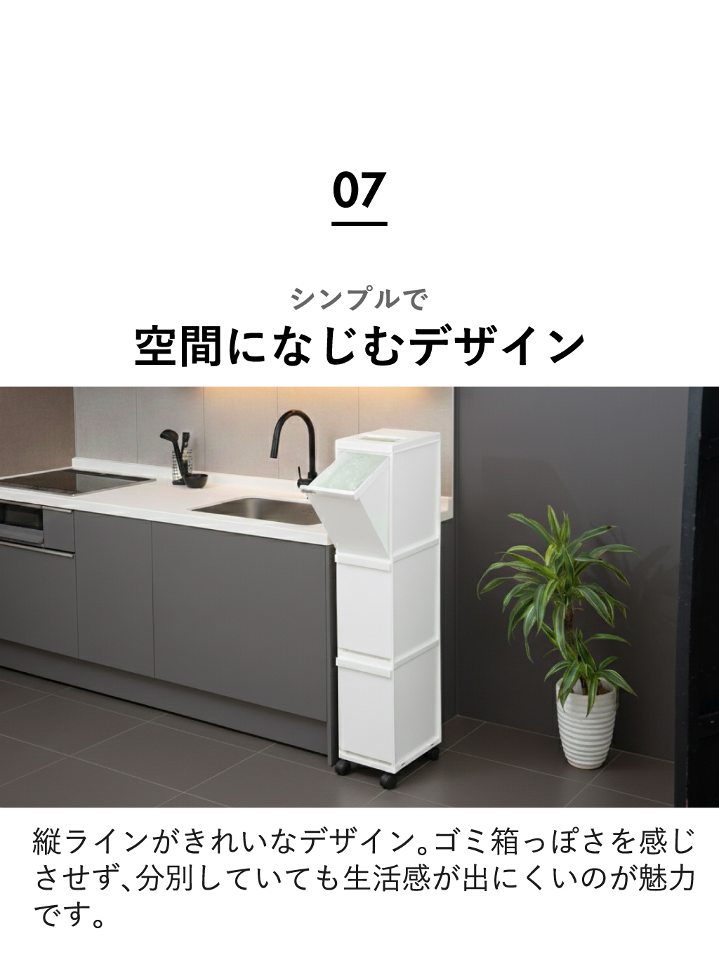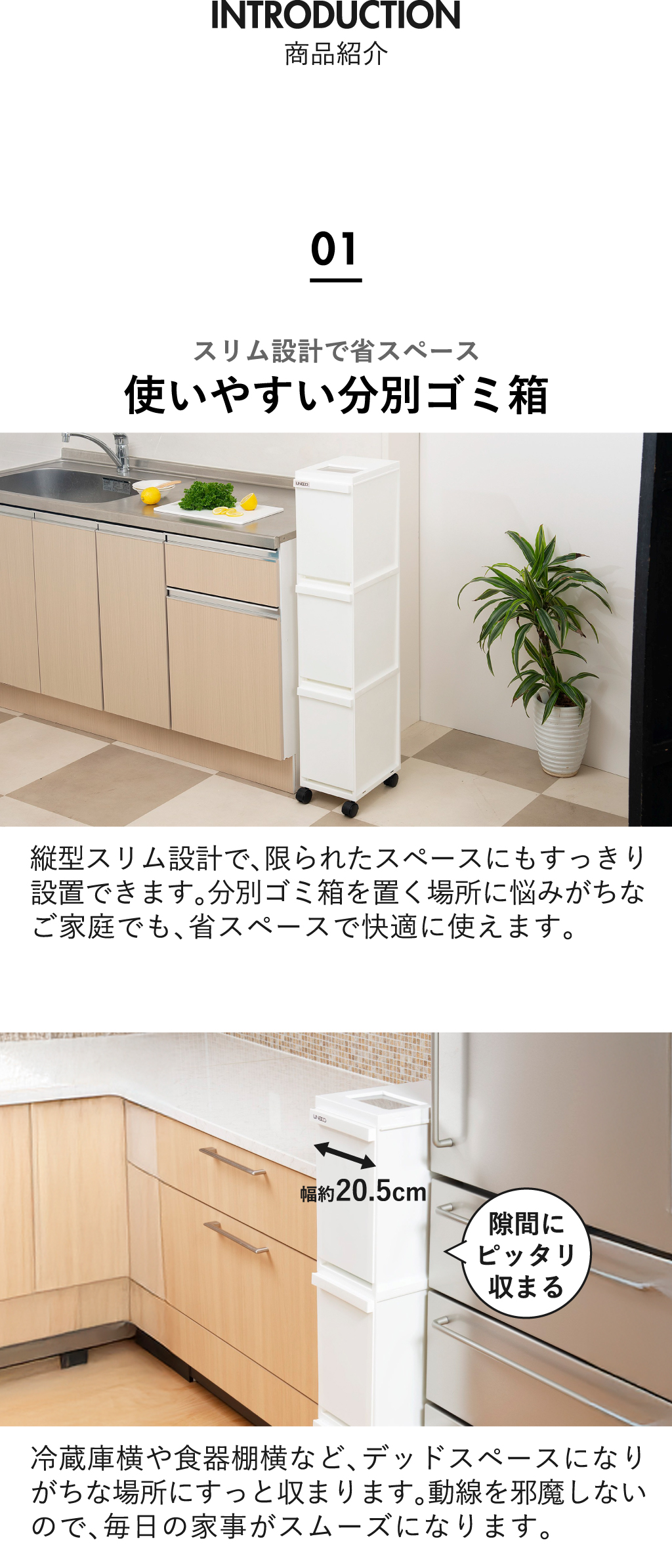 冷蔵庫横などのすき間にもすっと収まり、限られた空間でも無理なく分別ができます。