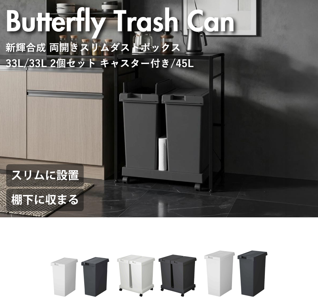 棚下やカウンター下を賢く活用できる両開きタイプのゴミ箱。