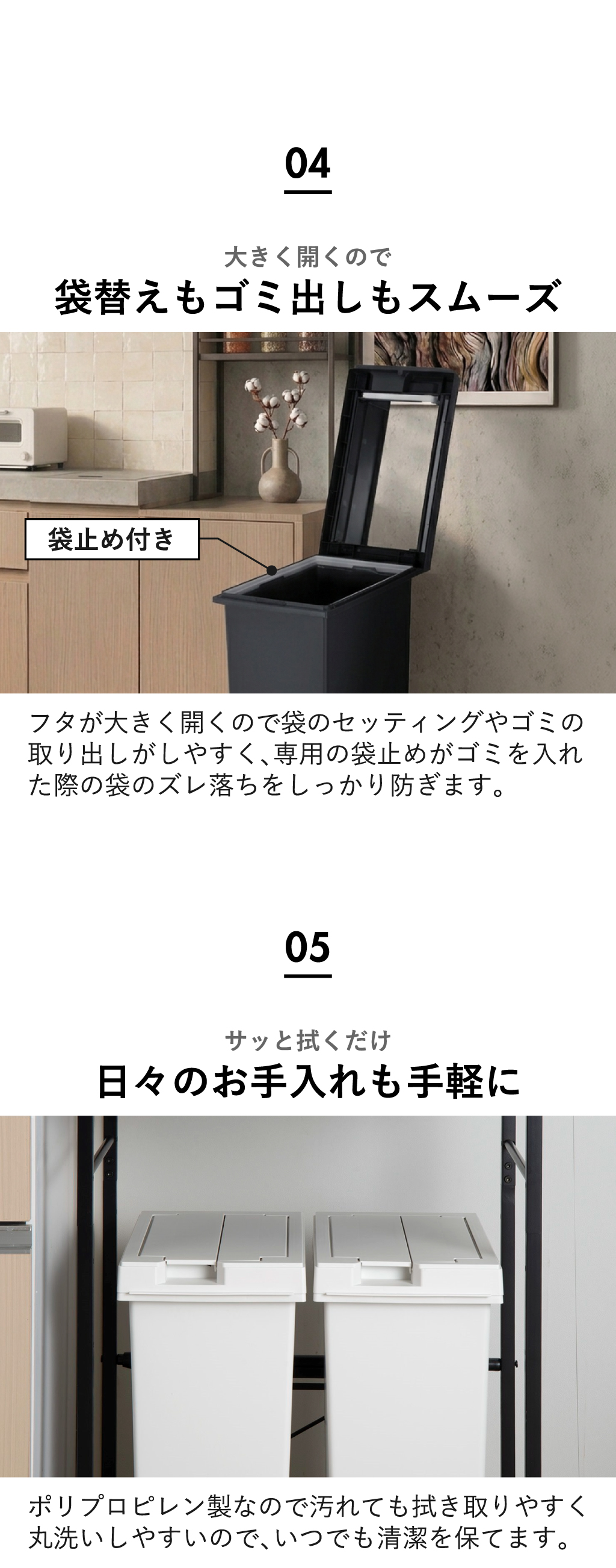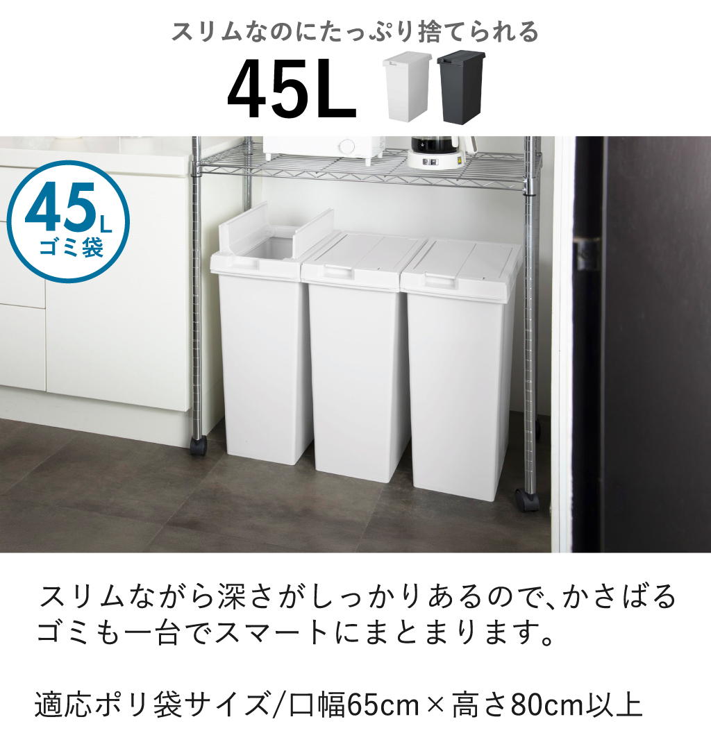 毎日使うゴミ箱として清潔に保てます。45リットル袋をムダなく活かせる深型設計。