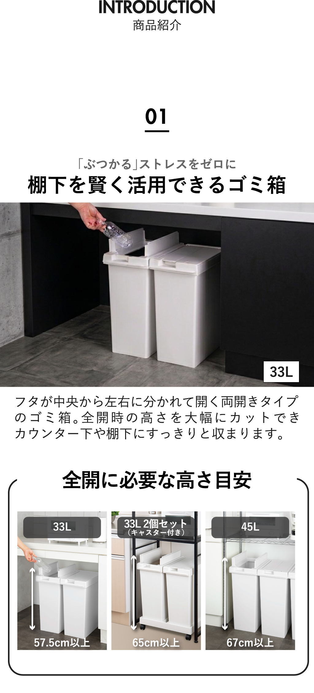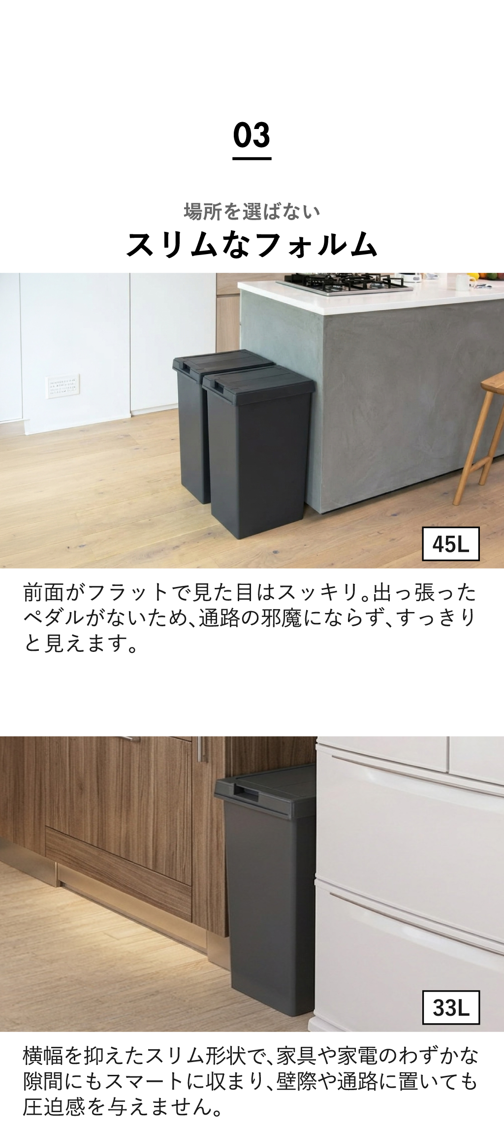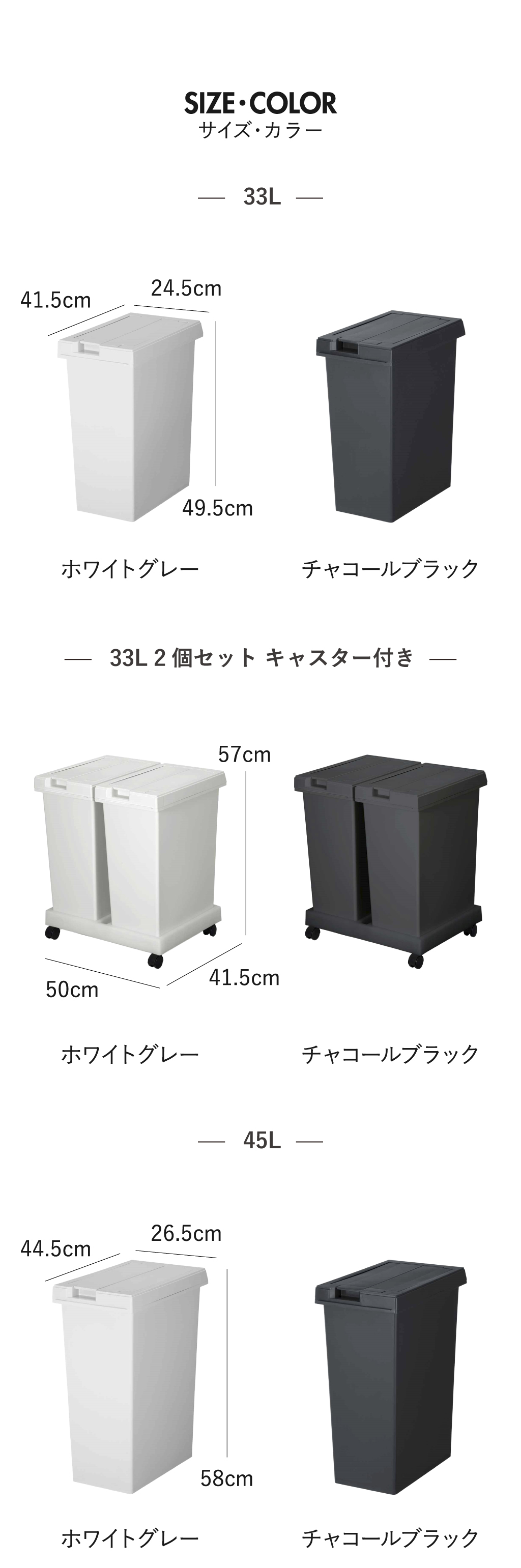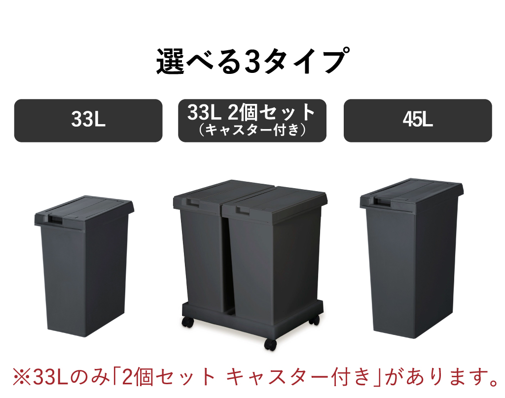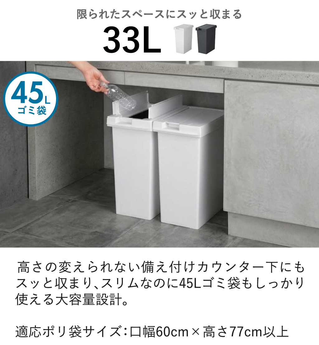 33Lと45Lどちらのサイズも45Lゴミ袋に対応しているため、日常使いしやすいのが嬉しいポイント。